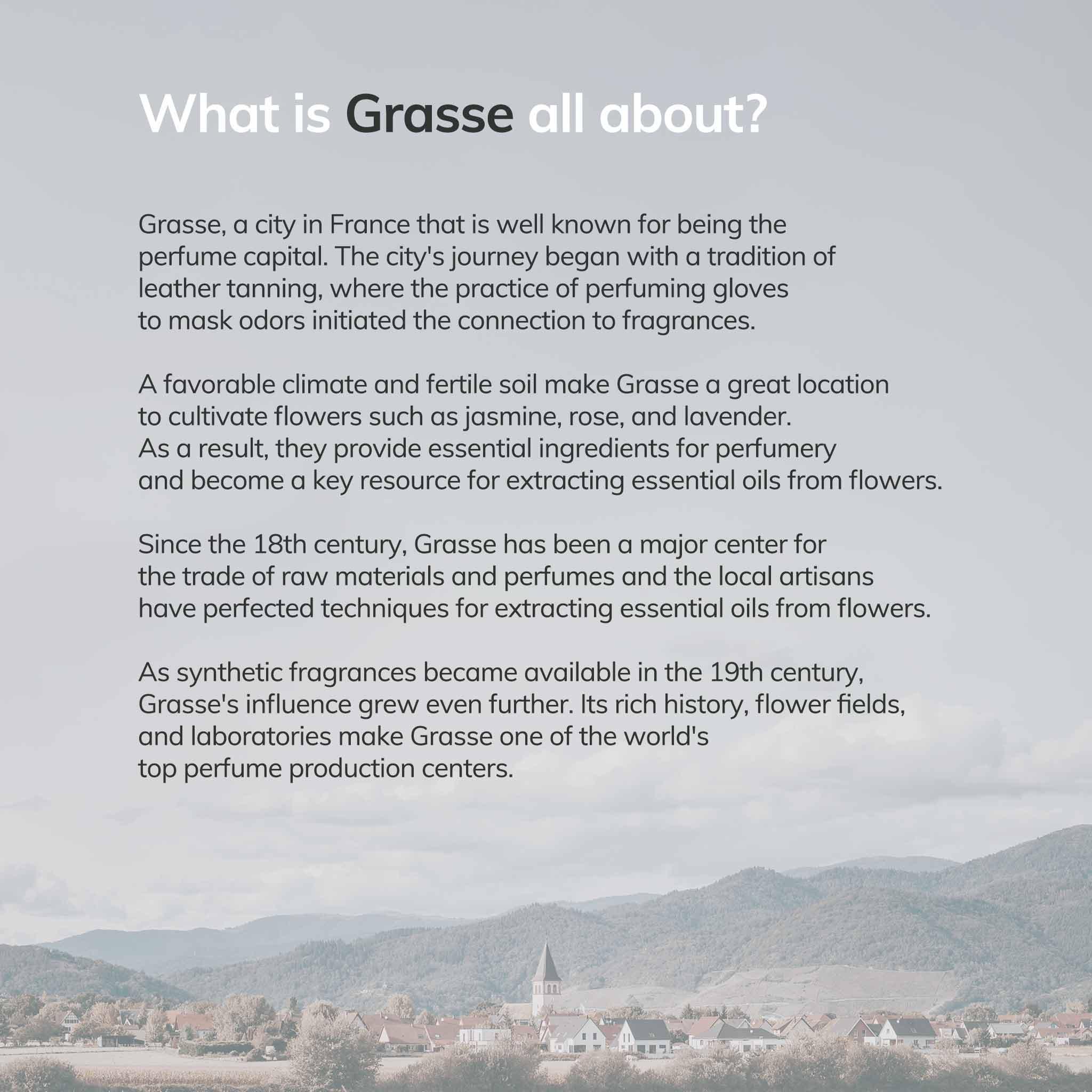 - Grasse is a city in the Provence-Alpes-Côte d'Azur region of France and it well-known as the capital of perfume, where its scent was designed by a local "Nose"