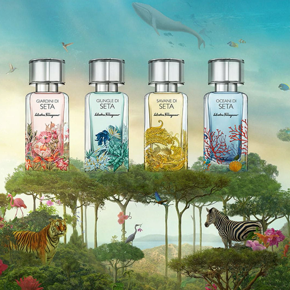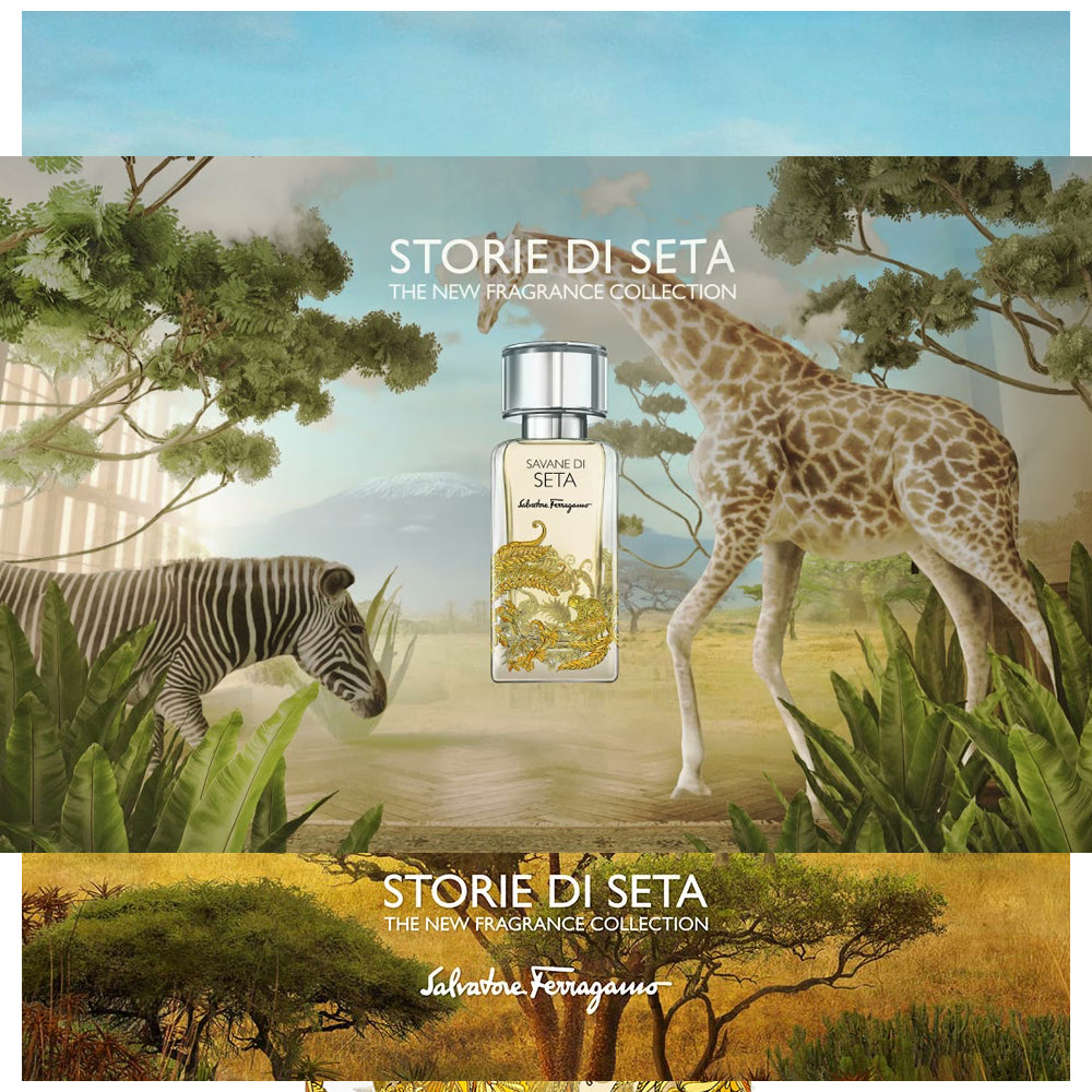 Storie di seta is the new line of fragrances inspired by the imaginary worlds of Salvatore Ferragamo's silk creations. A refined collection of four universal and fresh perfumes, each unique fragrance is bound by an exclusive mix.Savane di Seta is a fiery sunset on a mysterious savannah.