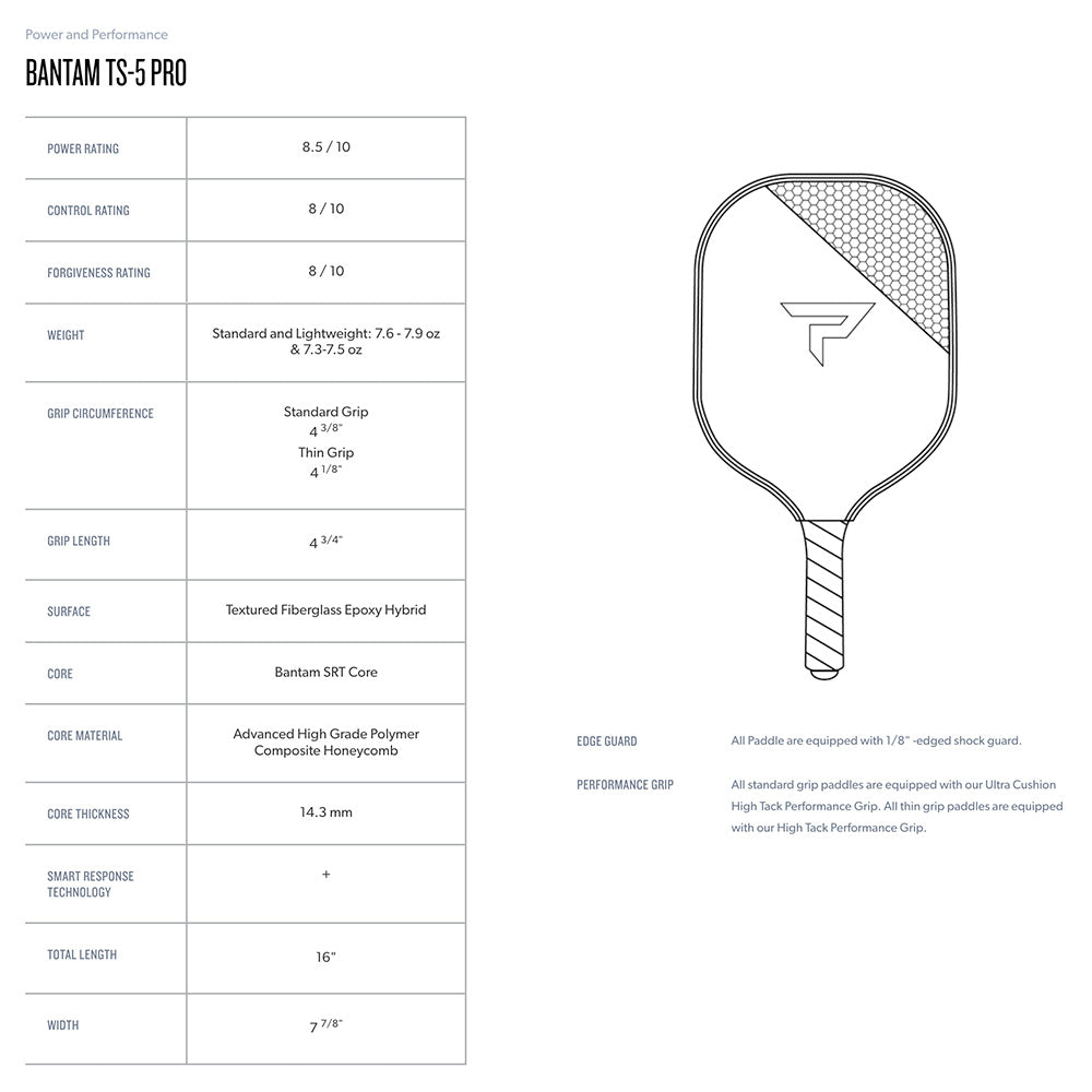 The Bantam TS-5 Pro pickleball paddle is a lighter version of the EX-L Pro model with Smart Response Technology. The expanded playing surface provides optimal power and a larger sweet spot. The TS-5 is equipped with a UV-coated fiberglass textured surface which adds spin and durability. The updated model seen here features an upgraded core and a new modern design with standout color and bold lines. Available in multiple weights for every type of player.