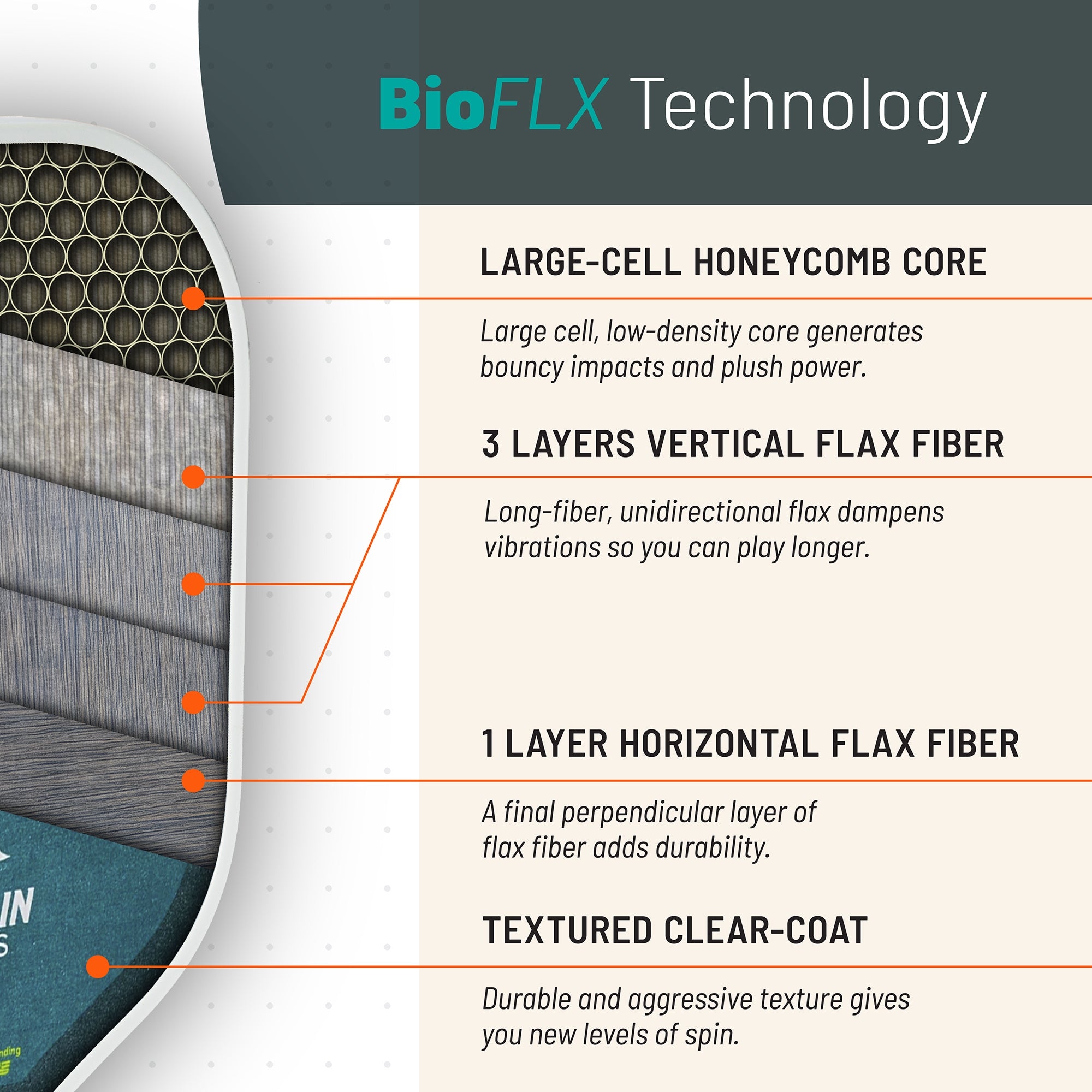 Features BioFLX face technology, offering superior touch and vibration dampening for precise, controlled shots. This patent-pending surface mimics the feel of carbon fiber pickleball paddles while ensuring high performance for all skill levels.