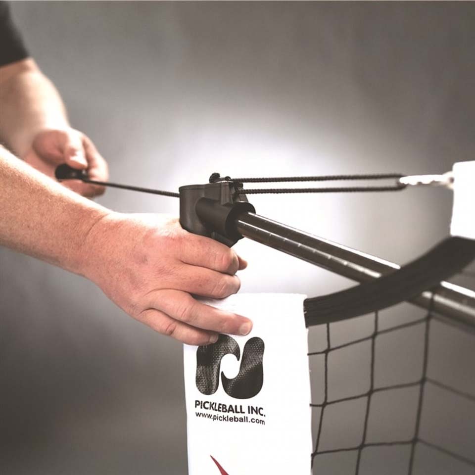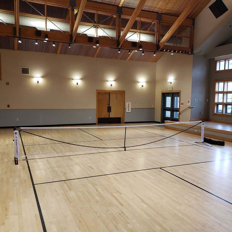 A portable net system transforms any indoor or outdoor space into a pickleball court within minutes.