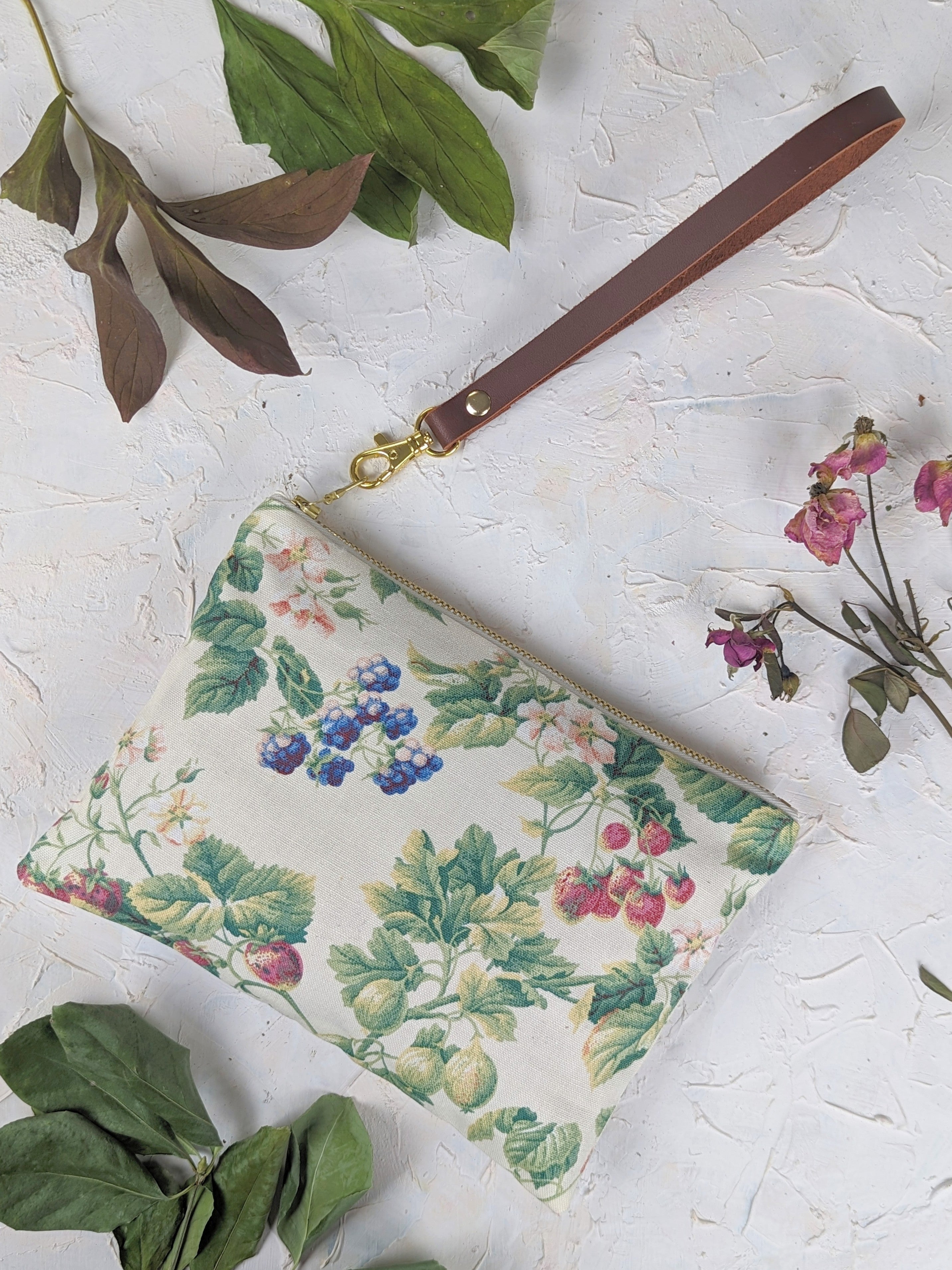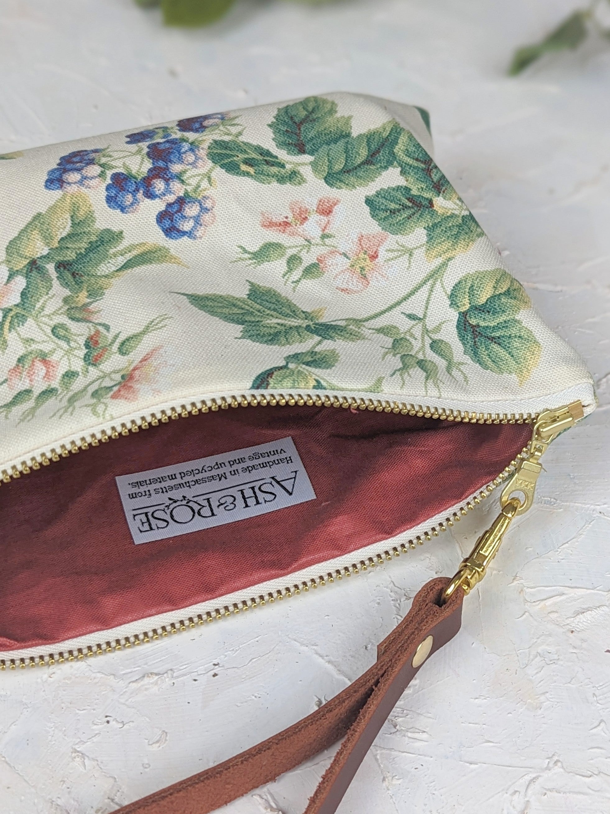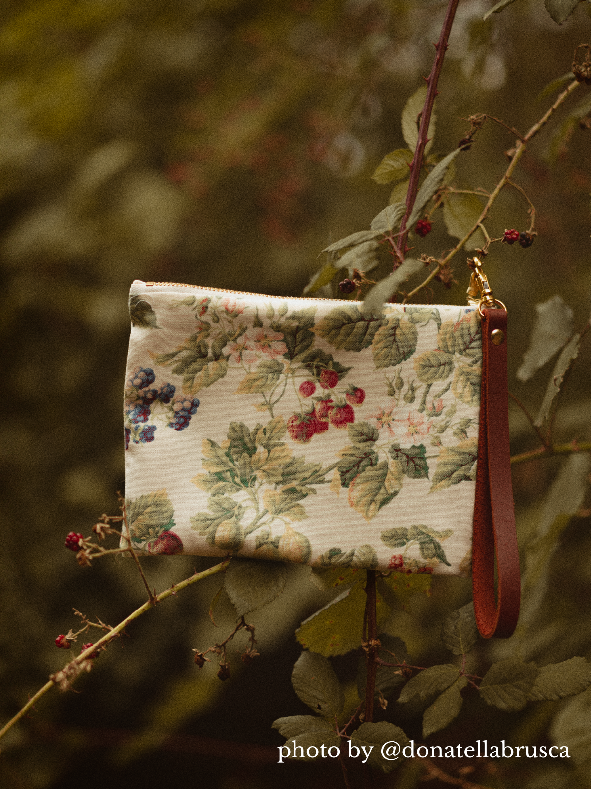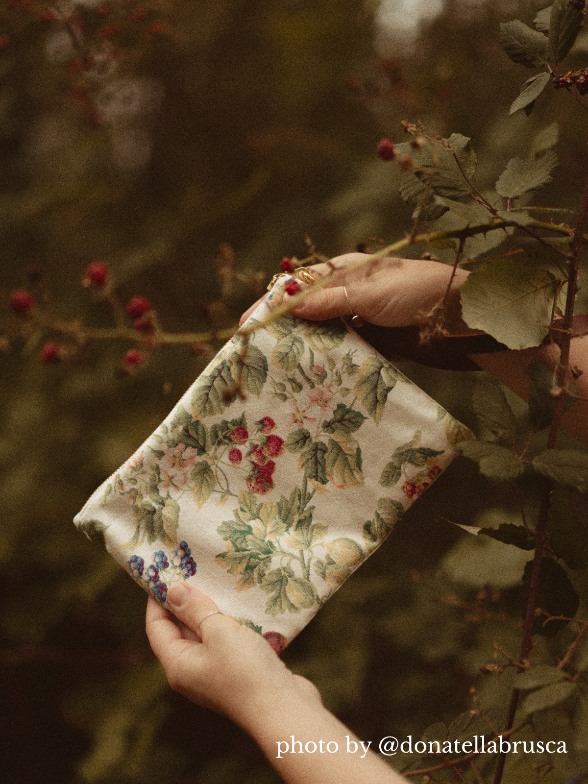 This extremely limited edition purse is made from wonderful vintage drapery fabric that shows our favorite berries on the vine, with their leaves, just ready for picking. It is lined with a delightful vintage raspberry colored polished cotton.