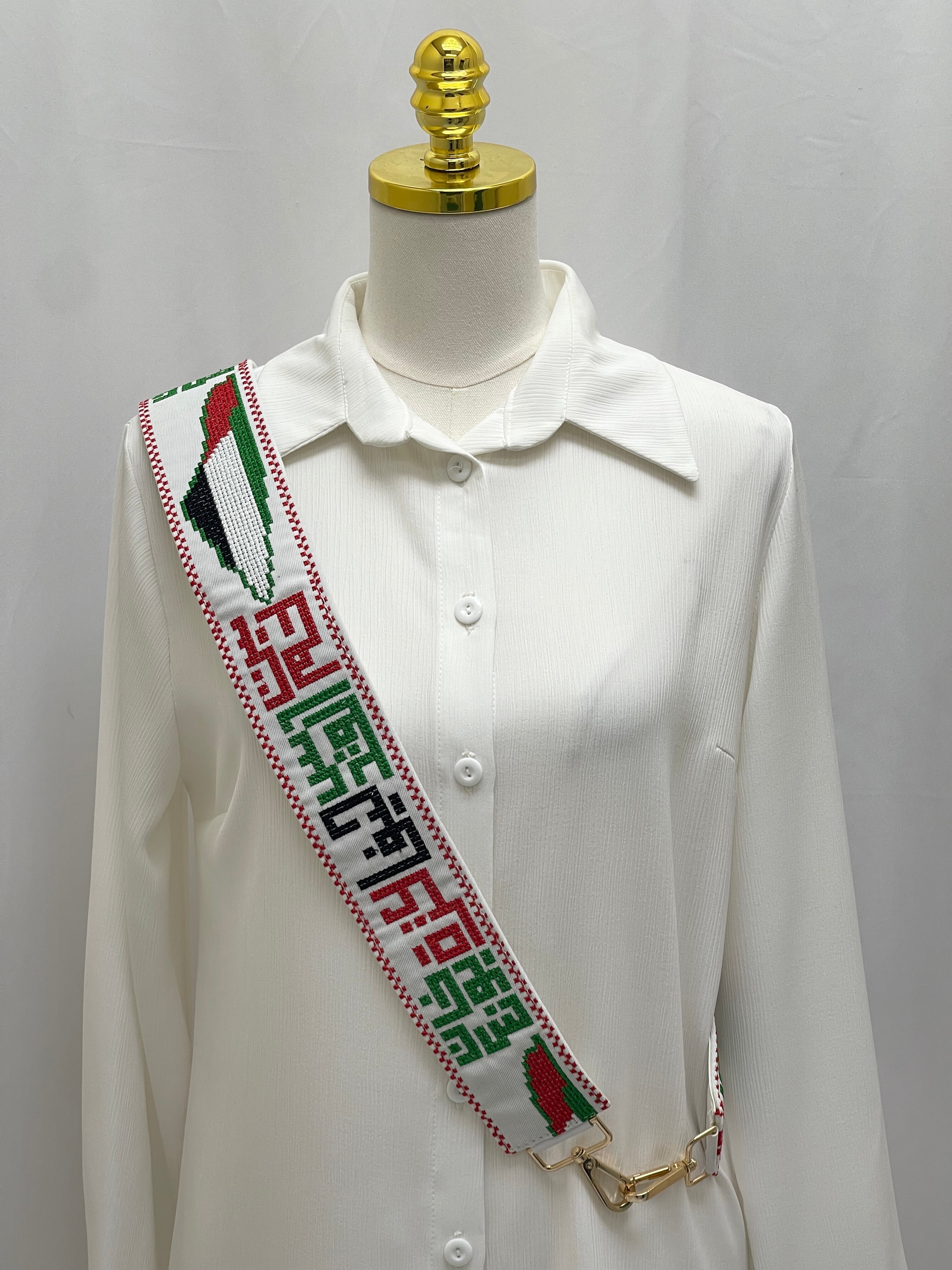 Represent your Palestinian pride with our Palestinian City's Name & Map Purse Strap. Made with high-quality materials, this strap features the names and map of beloved Palestinian cities, beautifully embroidered in vibrant colors and Arabic calligraphy. Crafted with precision and care, this strap ensures durability and style, making it a lasting addition to your accessory collection. Show your support and appreciation for Palestinian heritage with this unique and meaningful accessory, perfect for enhancing any handbag with its cultural elegance.