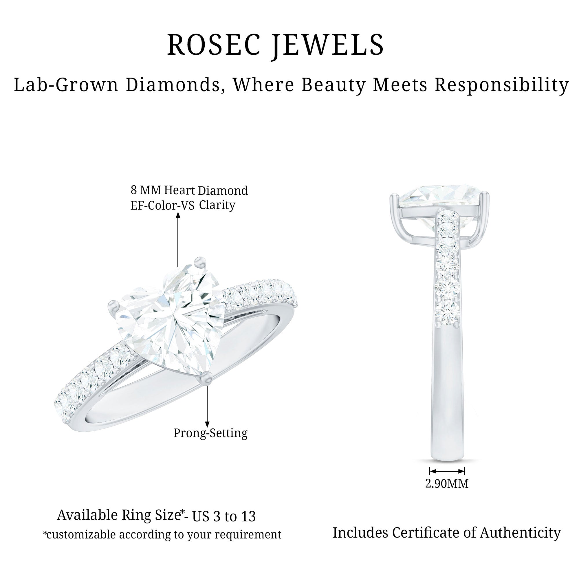 This Lab Created Diamond Engagement Ring is a unique and romantic pick that sparkles beautifully, making it a truly eye-catching choice. With top-notch craftsmanship and a stunning design, this Solitaire Engagement Ring features an 8 MM Heart Shape Lab Grown Diamond set in prongs, taking the spotlight and flanked by round cut side stones that elegantly enhance the band. As a genuinely radiant piece, this Heart Shape Engagement Ring represents the love you share and will treasure forever. This Diamond Heart Ring is a promise of a lovely future, highlighted by its gorgeous simplicity. Shining from every angle, it is an affordable option, featuring a Lab Grown Diamond with EF Color and VS Clarity, making it a reliable investment. This 2 Carat Diamond Ring comes in a variety of metal choices, and we also create different ring sizes according to US standards, ranging from 3 to 13. To guarantee the perfect fit, a free ring sizer can be sent upon request before the final product arrives.