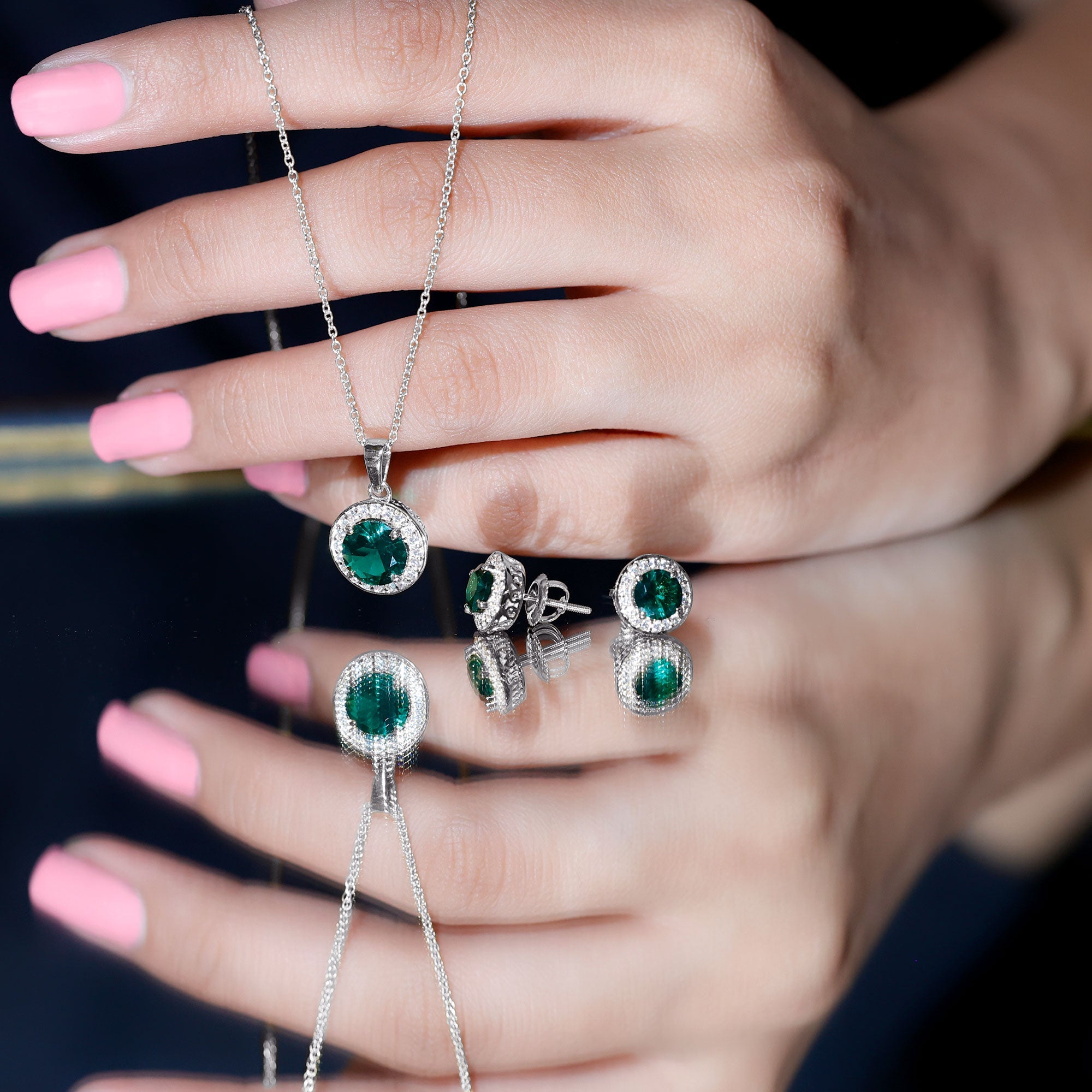 For those in search of a sophisticated and eye-catching office wear accessory, look no further than this Created Emerald Jewelry Set. Featuring a stunning Round Cut Created Emerald and Zircon in a Halo Style, this gold set is sure to make a statement.