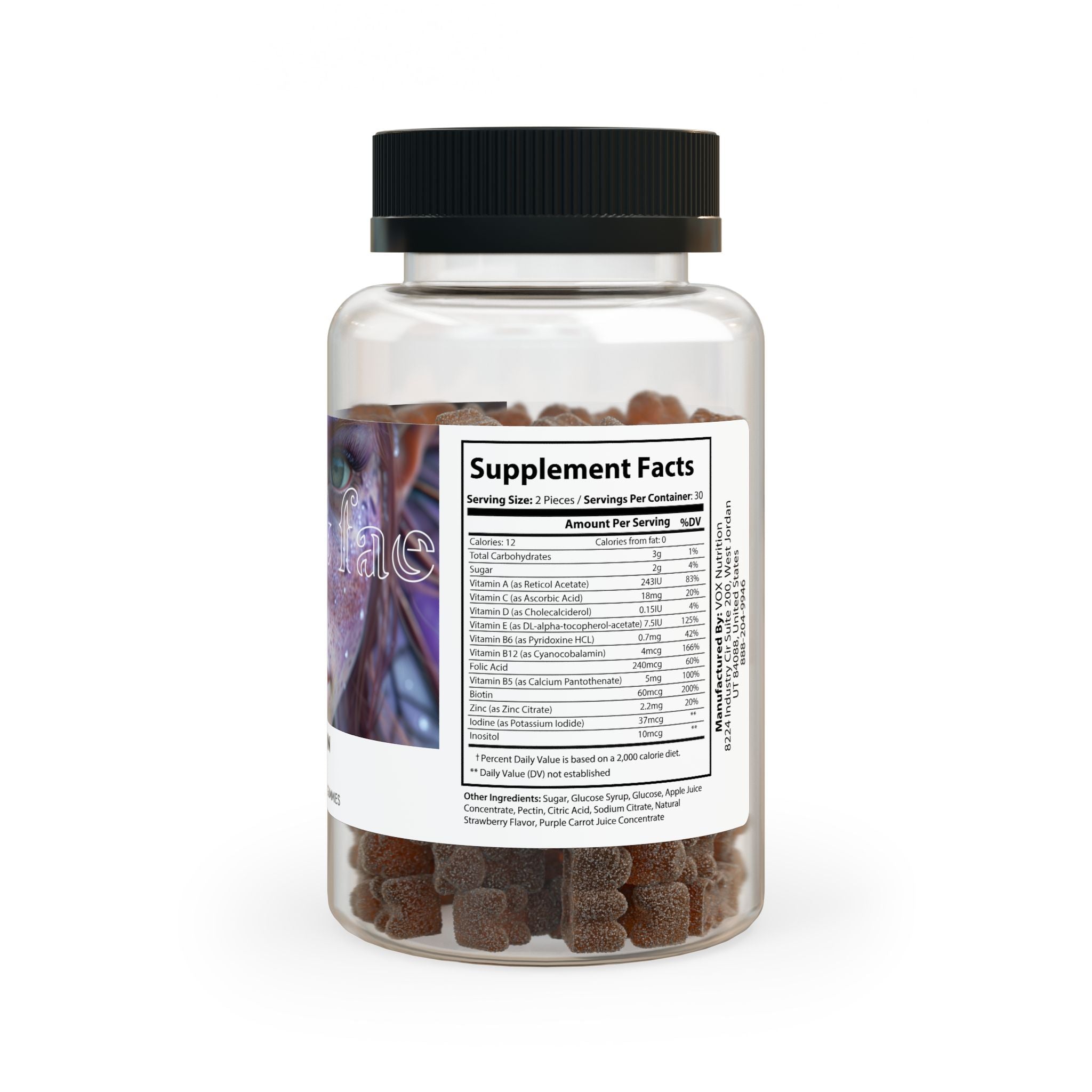 Ingredients: Vitamin A (as Reticol Acetate), Vitamin C (as Ascorbic Acid), Vitamin D (as Cholecalciderol), Vitamin E (as DL-alpha-tocopherol-acetate), Vitamin B6 (as Pyridoxine HCL), Vitamin B12 (as Cyanocobalamin), Folic Acid, Vitamin B5 (as Calcium Pantothenate), Biotin, Zinc (as Zinc Citrate), Iodine (as Potassium Iodide), Inositol. Other Ingredients: Sugar, Glucose Syrup, Glucose, Apple Juice Concentrate, Pectin, Citric Acid, Sodium Citrate, Natural Strawberry Flavor, Purple Carrot Juice Concentrate