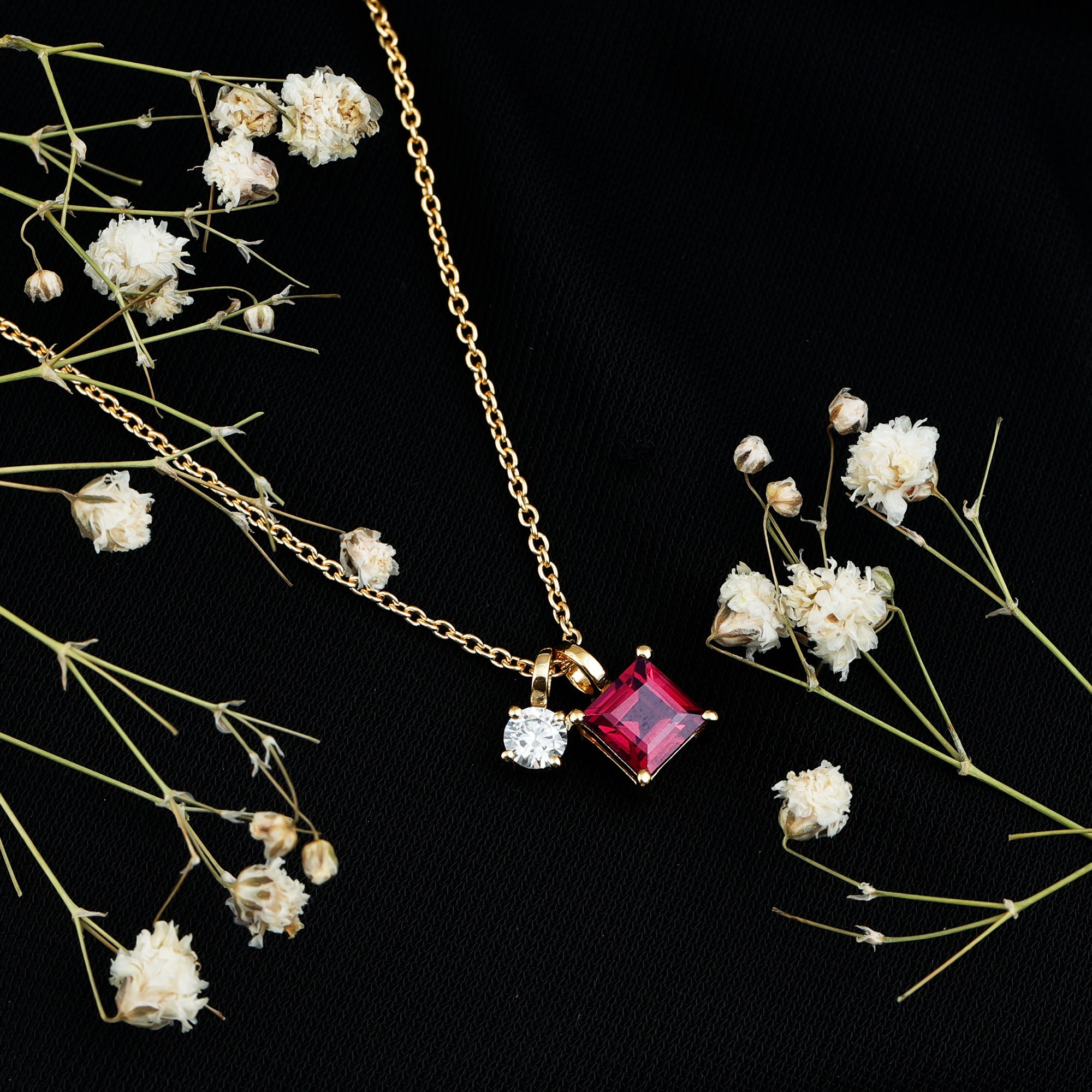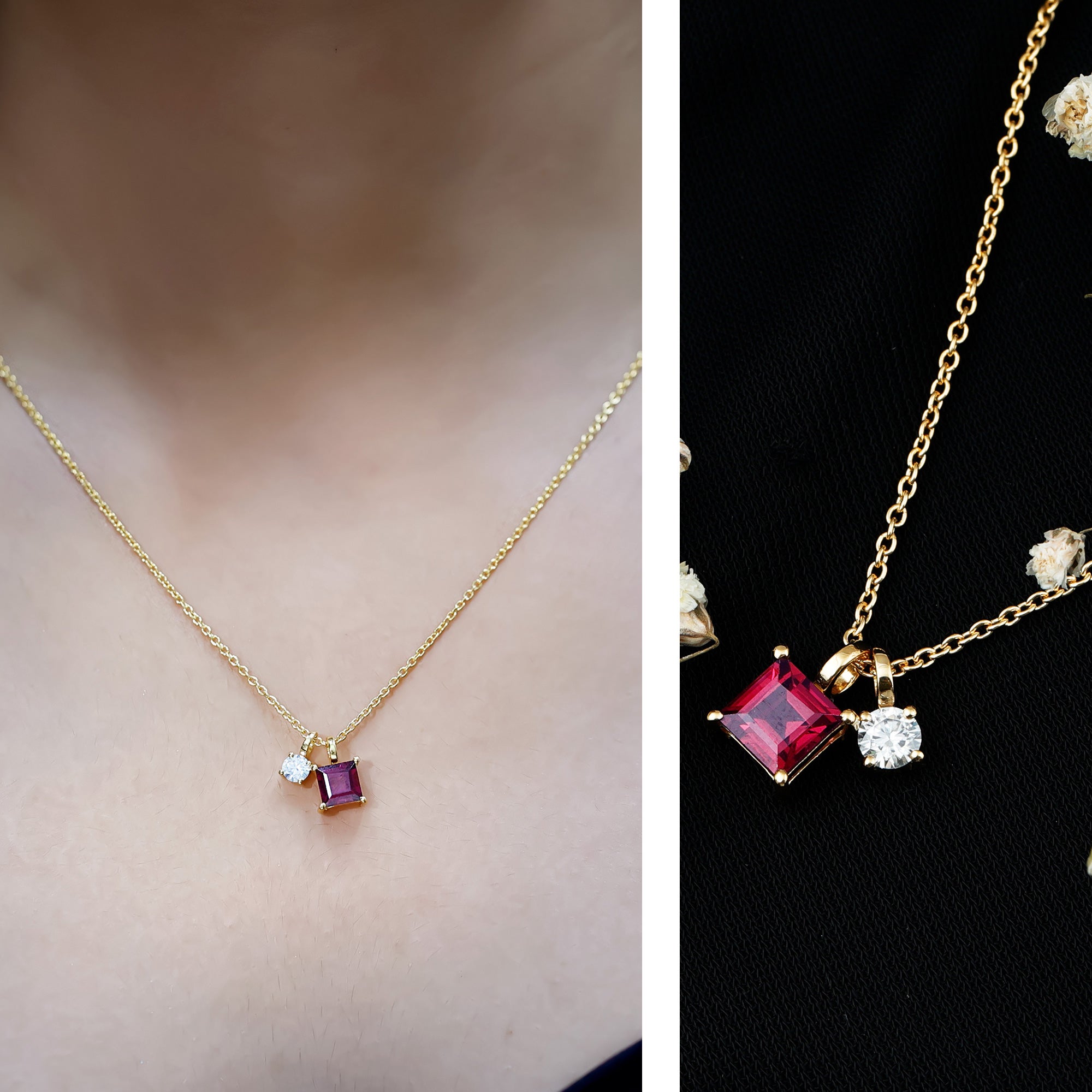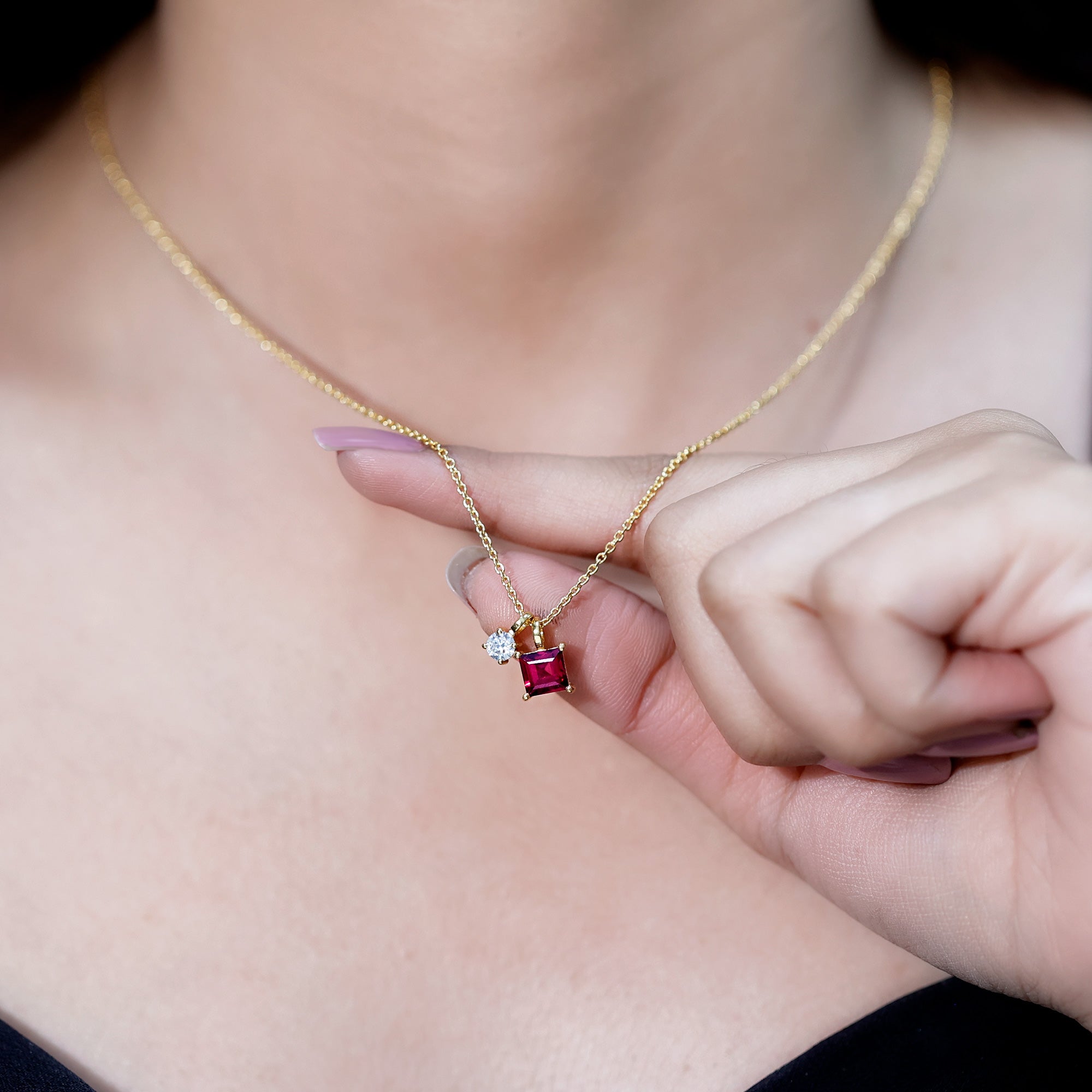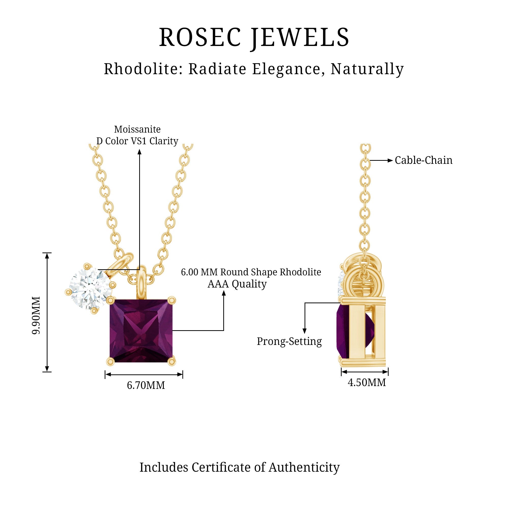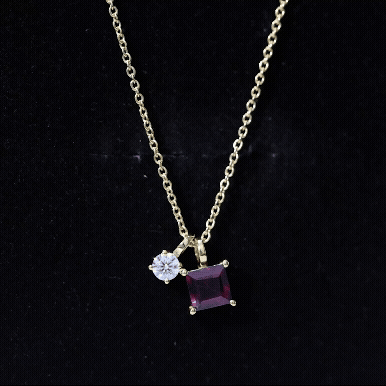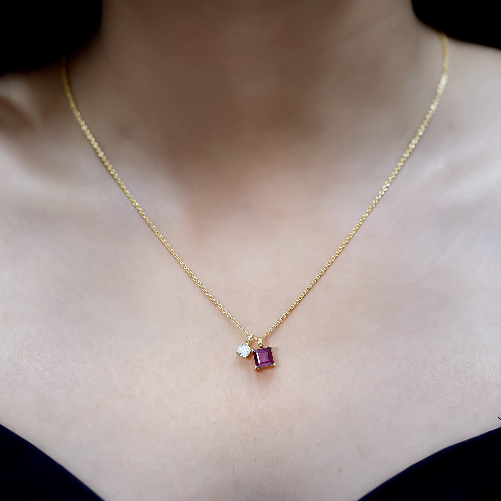 A timeless piece that honors your birth month in the most beautiful way. Designed with a modern yet meaningful look, the Necklace with Charm features a beautiful 6 MM Princess Cut Rhodolite paired with a 4 MM Round Moissanite, both securely set in prong setting that lets the stones shine from every angle. It is like two different souls complementing each other perfectly. This makes the Rhodolite Garnet Necklace a thoughtful gift for someone special or a lovely treat for yourself. The June Birthstone Necklace gracefully dangles from a durable cable chain, finished with a lobster clasp that allows for easy length adjustment to suit your style. The entire piece is crafted from 14k yellow gold plated silver, giving it that rich golden glow while remaining lightweight and comfortable for everyday wear. With its charming two-stone design, this Princess Cut Necklace is perfect for birthdays, anniversaries, or simply marking a new chapter in life. The Rhodolite represents passion and strength, while Moissanite brings brilliance and clarity, a perfect pair to wear close to your heart. Packaged in a premium jewelry box and accompanied by a certificate of authenticity, this Two Stone Necklace is ready to gift or keep as a timeless addition to your jewelry collection.