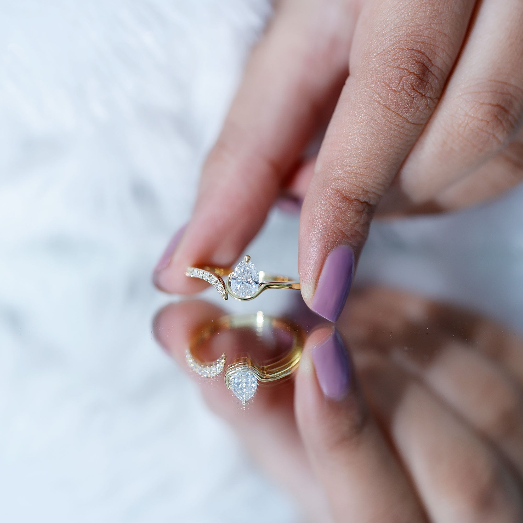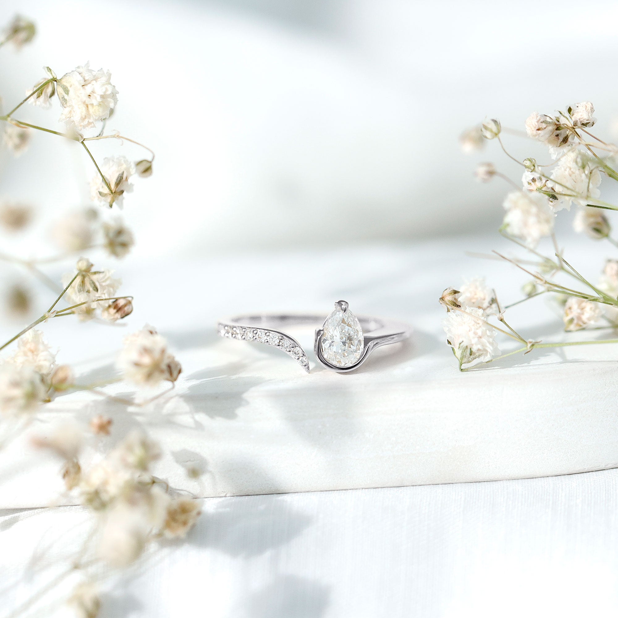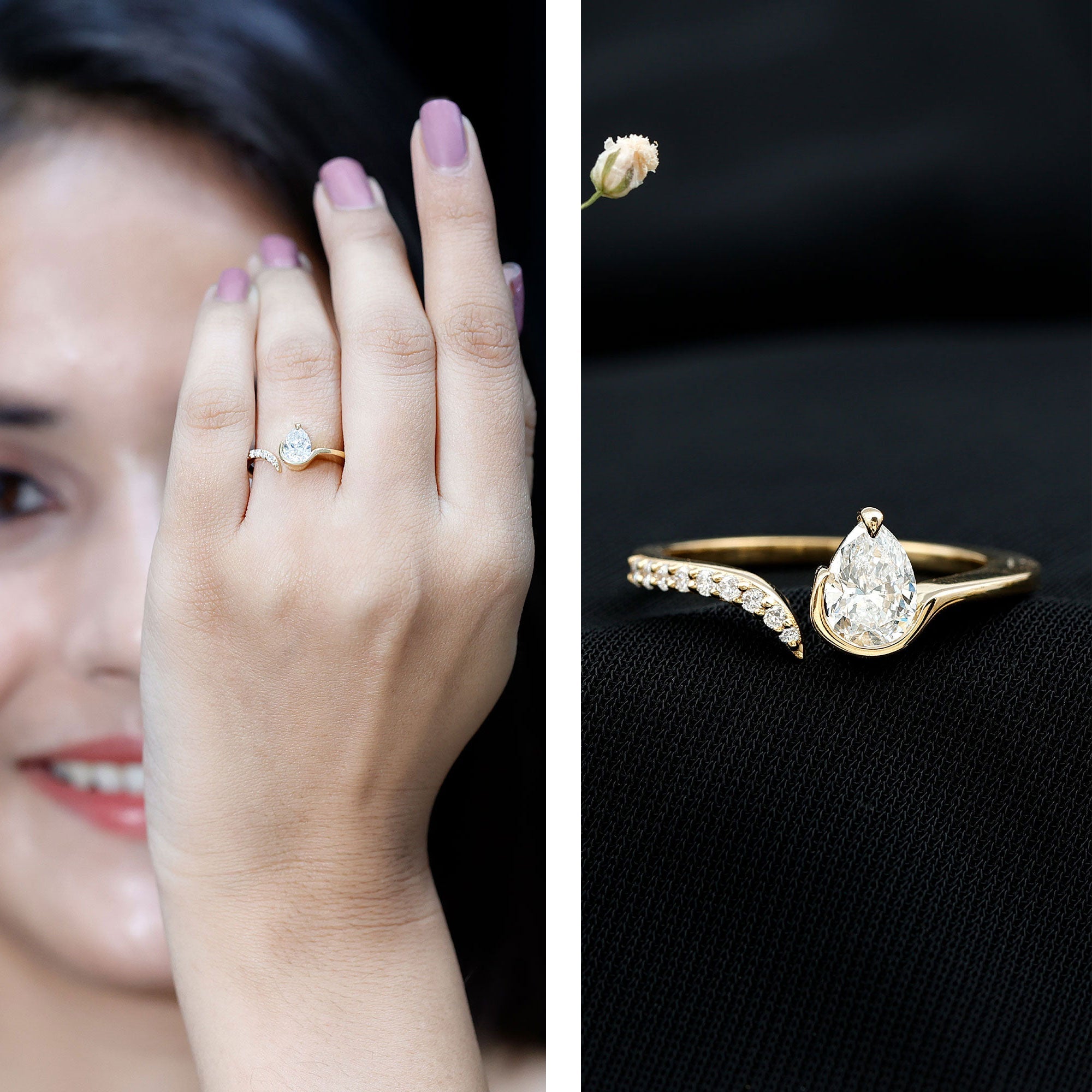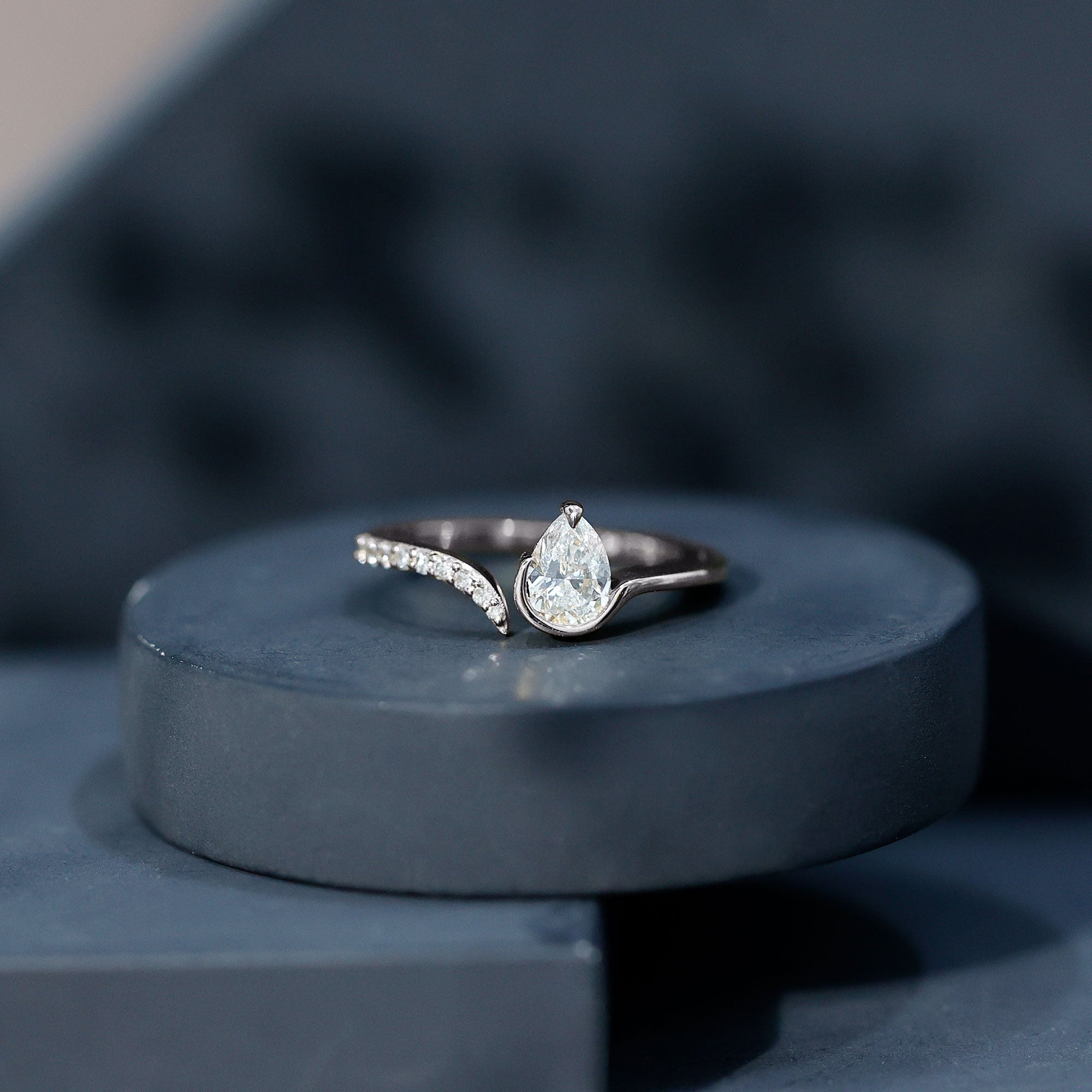 The cuff style of this Diamond Promise Ring is proof that beauty is not about being complete, but about being unique. This Teardrop Ring features a captivating pear cut lab grown diamond at the one end, cradled in a unique setting, while the other end of the band is adorned with a row of sparkling round diamonds. The wrap-around design symbolizes two souls coming together, making this Diamond Proposal Ring a perfect representation of commitment and devotion. Whether for an anniversary, birthday or just to show how much you care, this Pear Cut Diamond Ring makes an ideal present for your lady love that she will cherish forever.