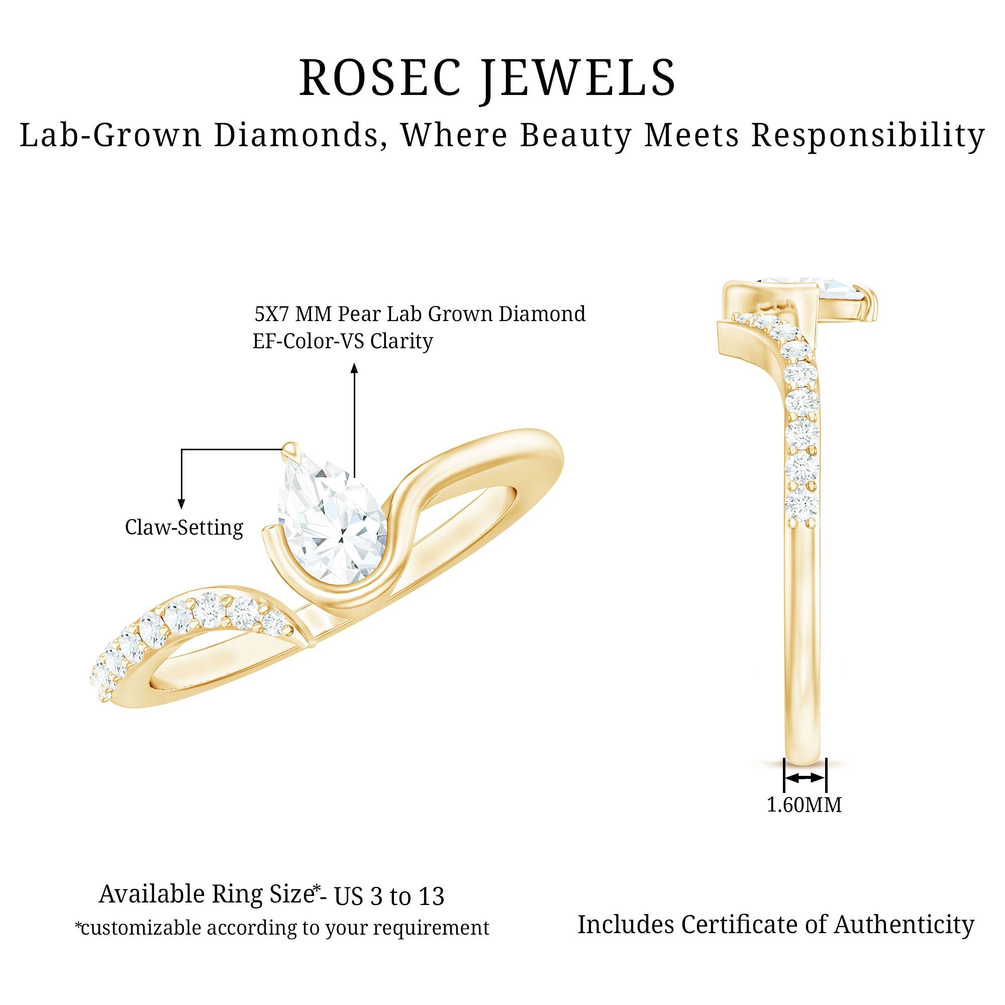 Certified Lab Grown Diamond Designer Promise Ring ‐ Lab - ( EF-VS ) / 10K Yellow Gold