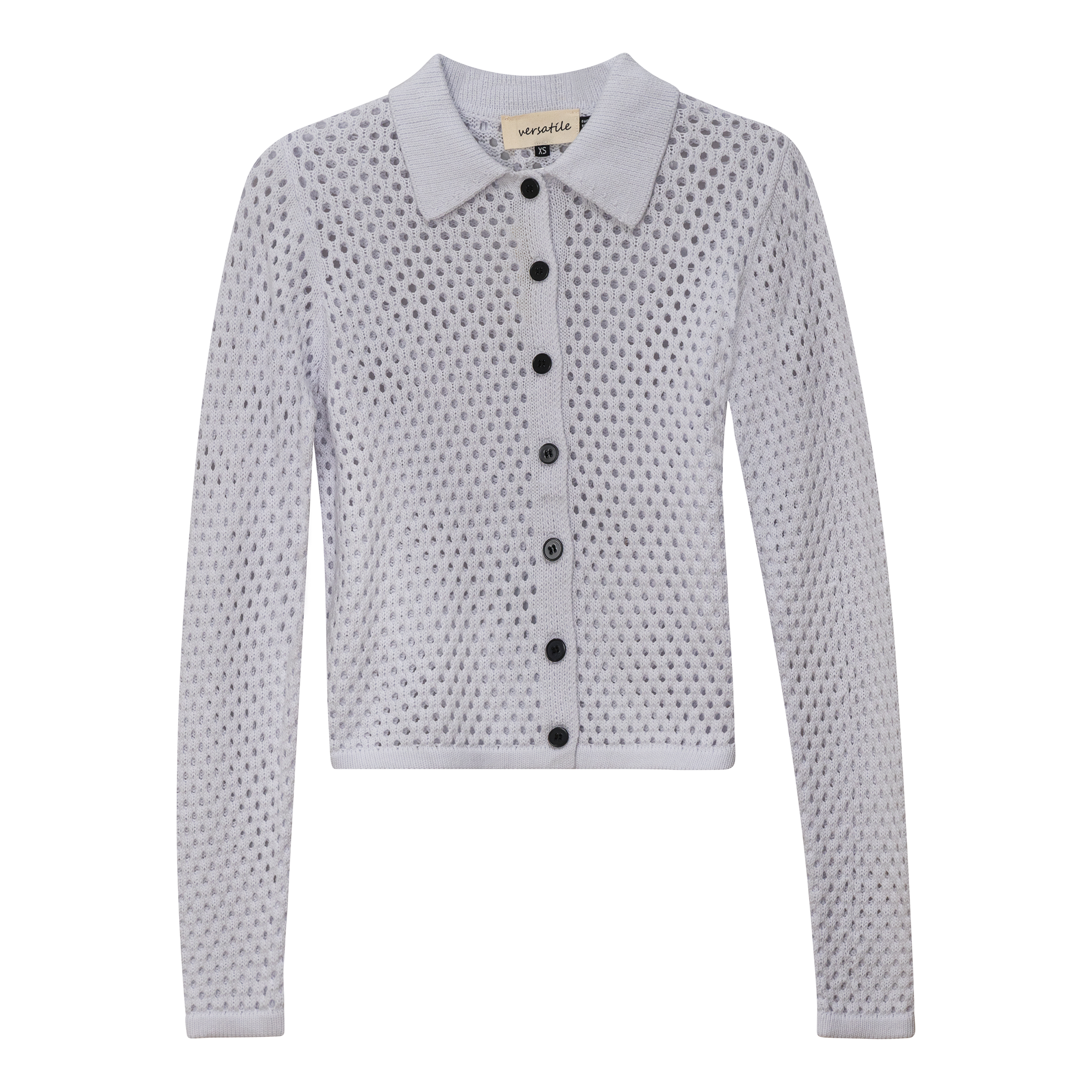 Ladies cropped crochet knit sweater with collar and center front button opening.ֲ