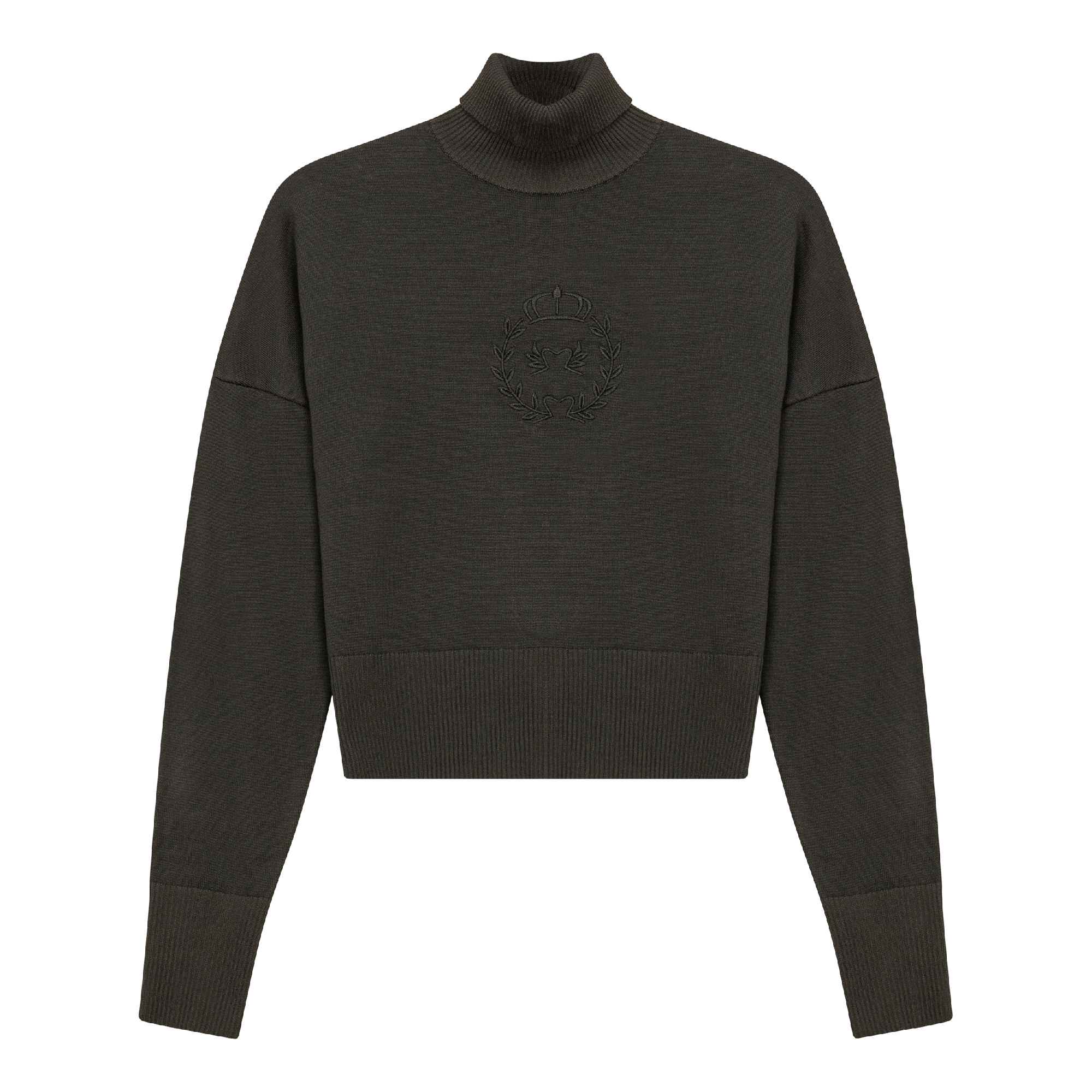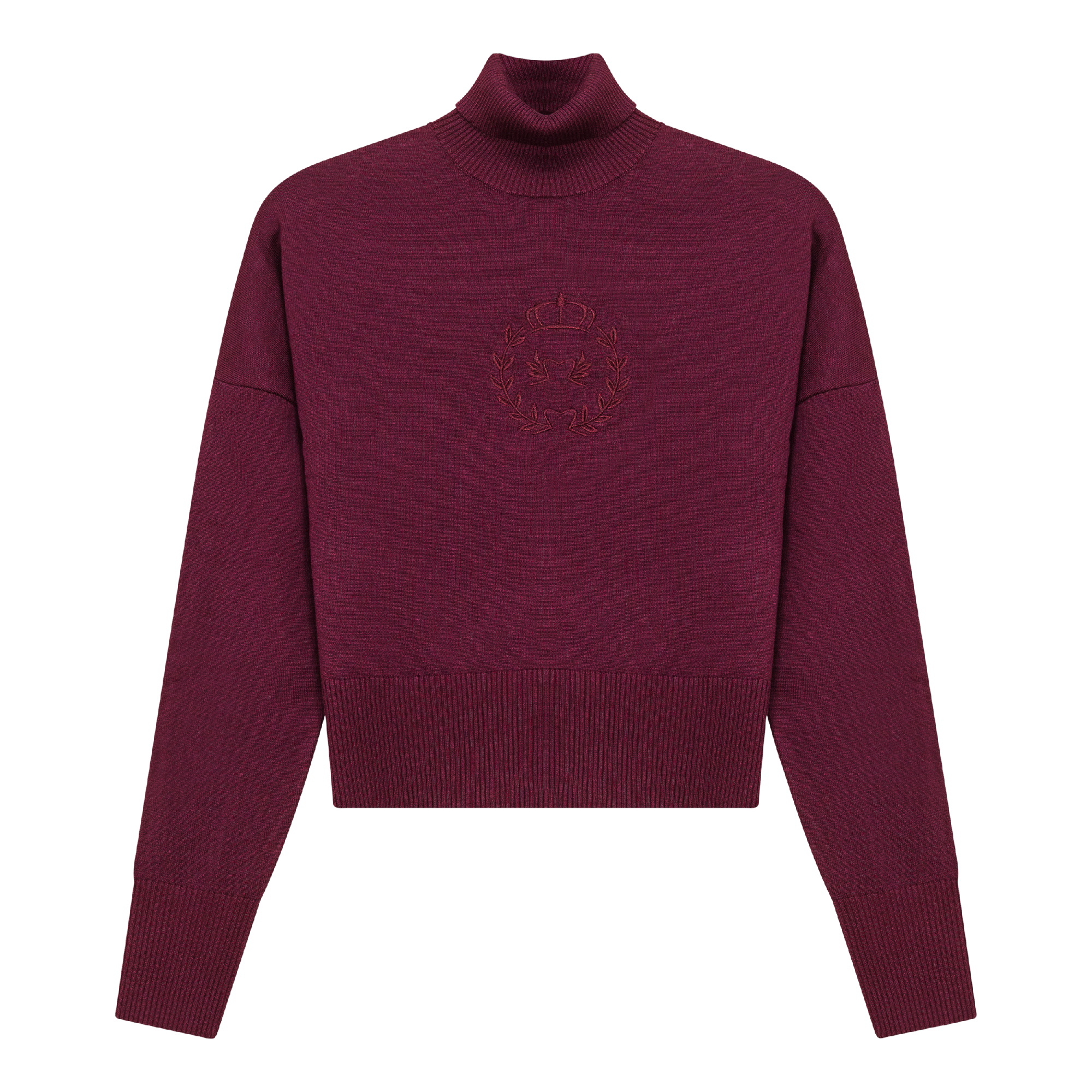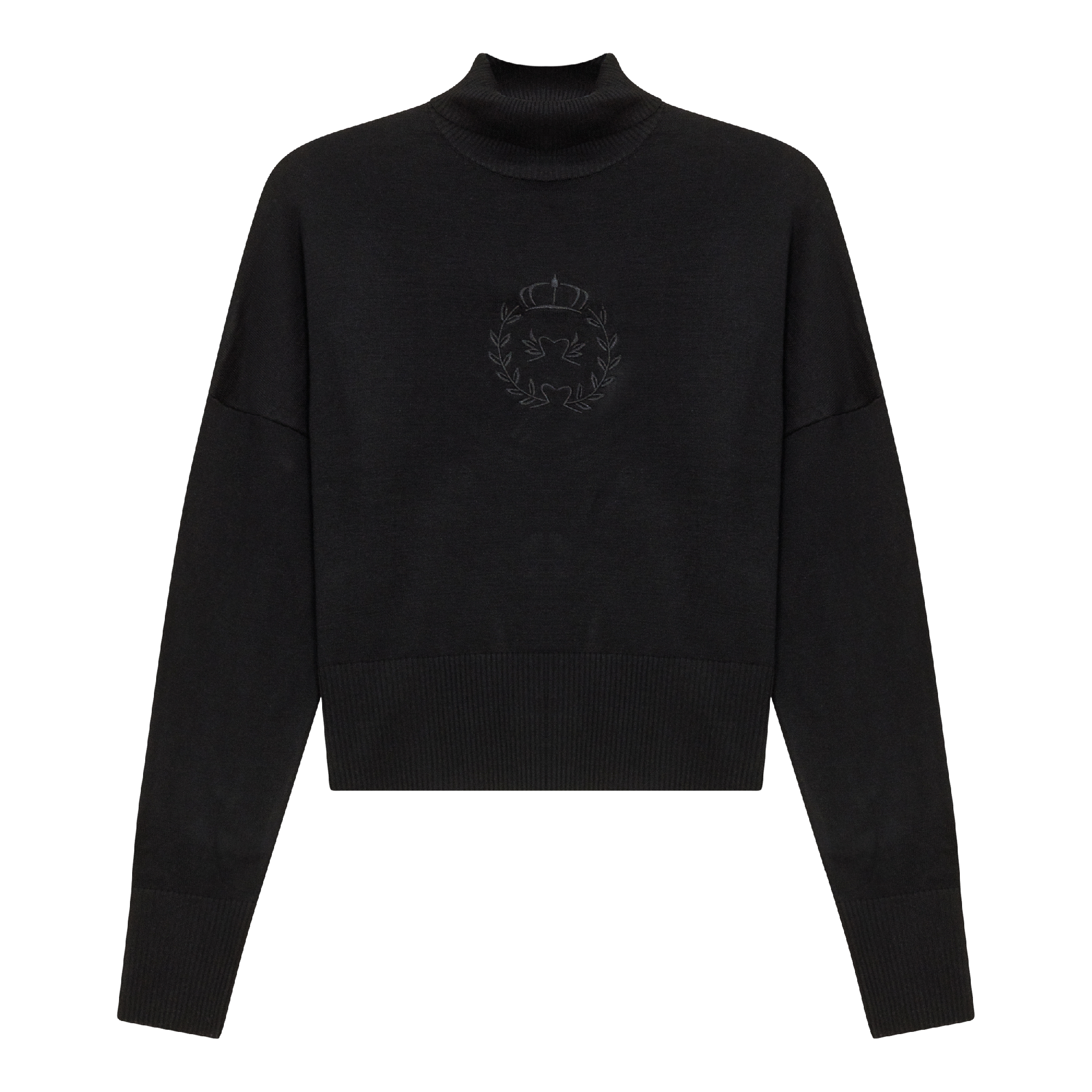 Ladies long sleeve cropped knit turtle neck with center front crest embroiderey and ribbed neckband and hemband. ֲ