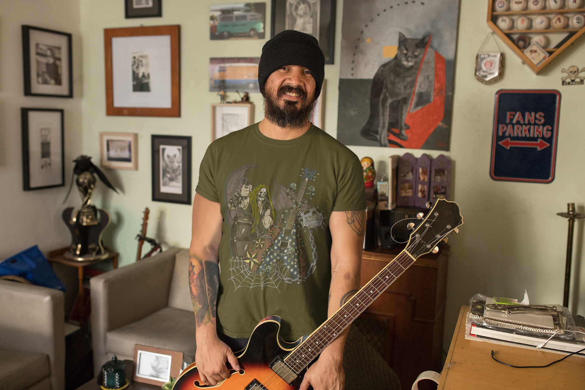 Ferocious Metal Music Figure: This shirt showcases a fierce metal music figure, exuding a commanding presence and emanating a dark aura. Clad in the apparel of the genre, the figure embodies the passion and intensity of death metal, igniting the fire within all true metalheads.