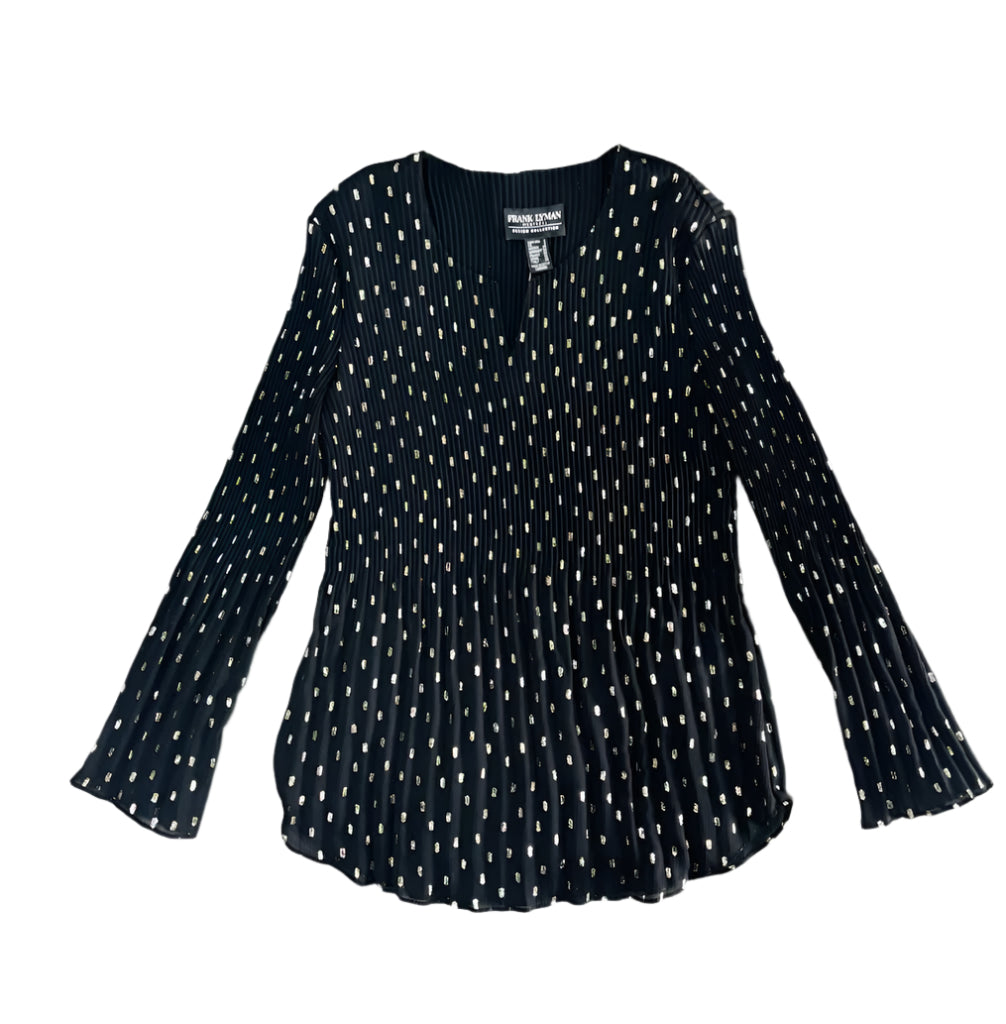 This Frank Lyman top exudes luxurious style with its elegant gold polka dot detailing, notched V-neck and long flutter sleeves.