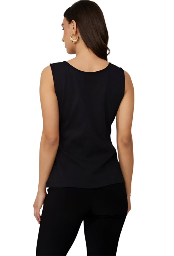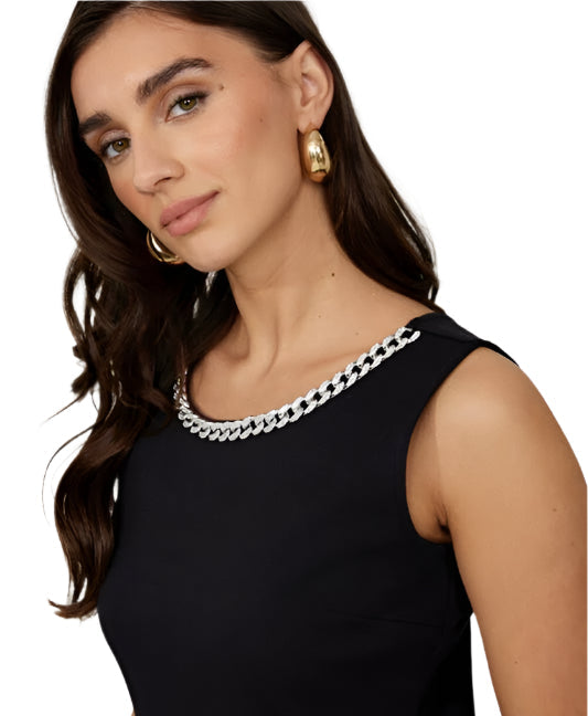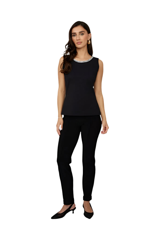 Discover the perfect blend of chic and casual with this fitted pullover top from Frank Lyman. Designed with a hip-length cut and a crew neck, this sleeveless piece features elegant jewel embellishments for a touch of sophistication. Ideal for any occasion, be it casual outings, office wear, or a night out, its plain pattern ensures versatile styling.