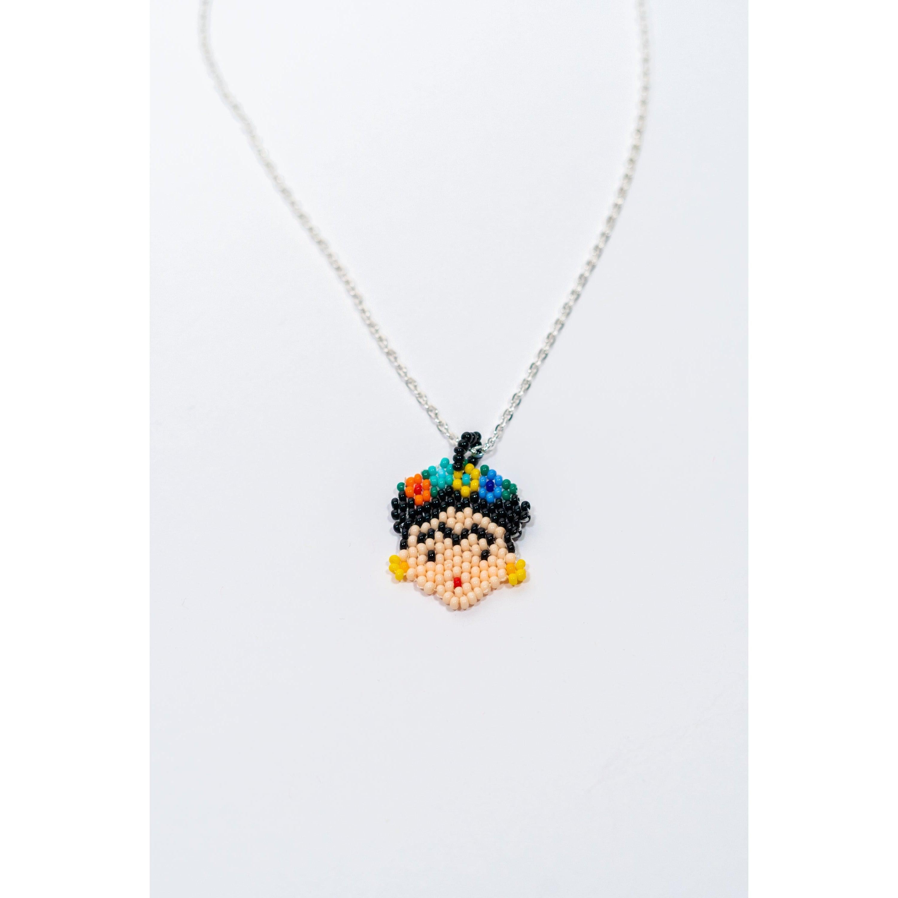 Our newest jewelry item from Mexico! Our Frida seed bead necklace is a wonderful rendition of our beloved Frida Kahlo. Hung on a 16" chain that is silver plated. Each Frida differs ever so slightly depending on the placement of the seed beads.
