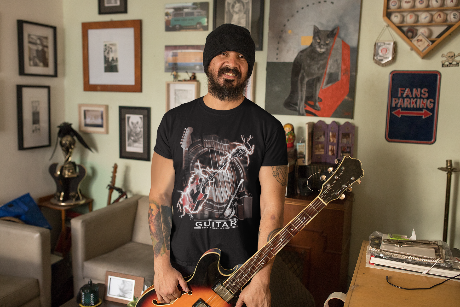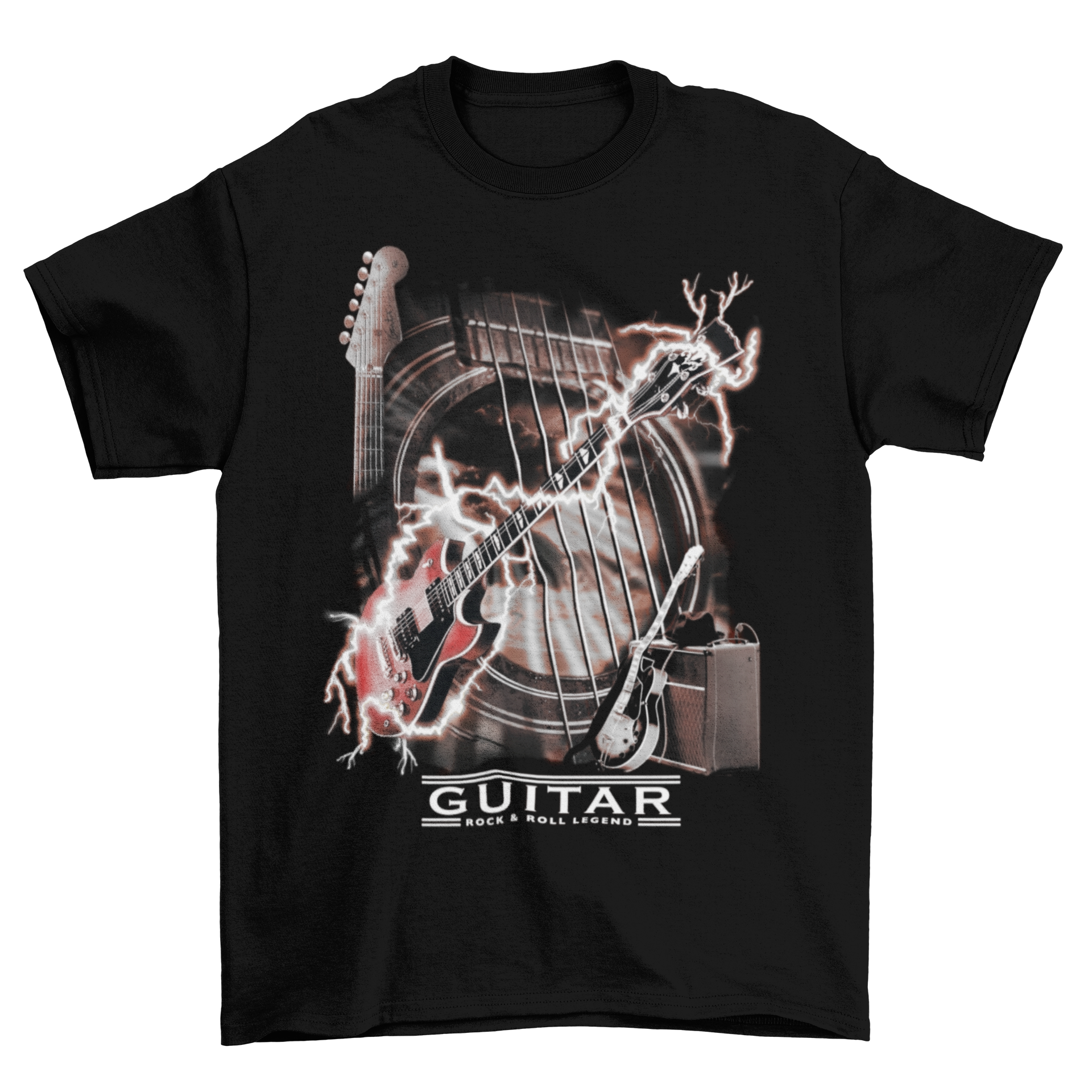 Featuring a dynamic illustration, this t-shirt showcases a guitar enveloped in electrifying bolts of lightning. The design symbolizes the electrifying nature of music, the adrenaline rush of live performances, and the passion that resonates from the strings of a guitar.