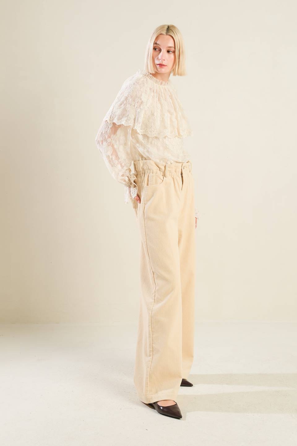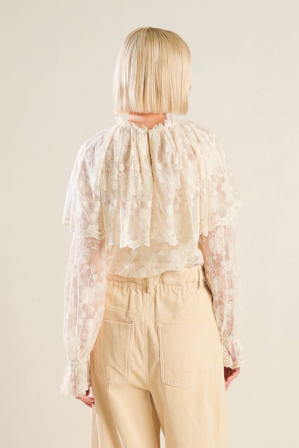 A woven lace top with laced edge neckline, long sleeve and back neck button closure