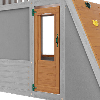 - Inspires pretend to play the ground level is a cool den where your kids can hang out, hide, and get messy in the sandbox. Little ones can crawl through the fabric doggie door or enter via the wooden door. There are window shades that can be rolled up and down, while outside there’s a wooden bench for recess.