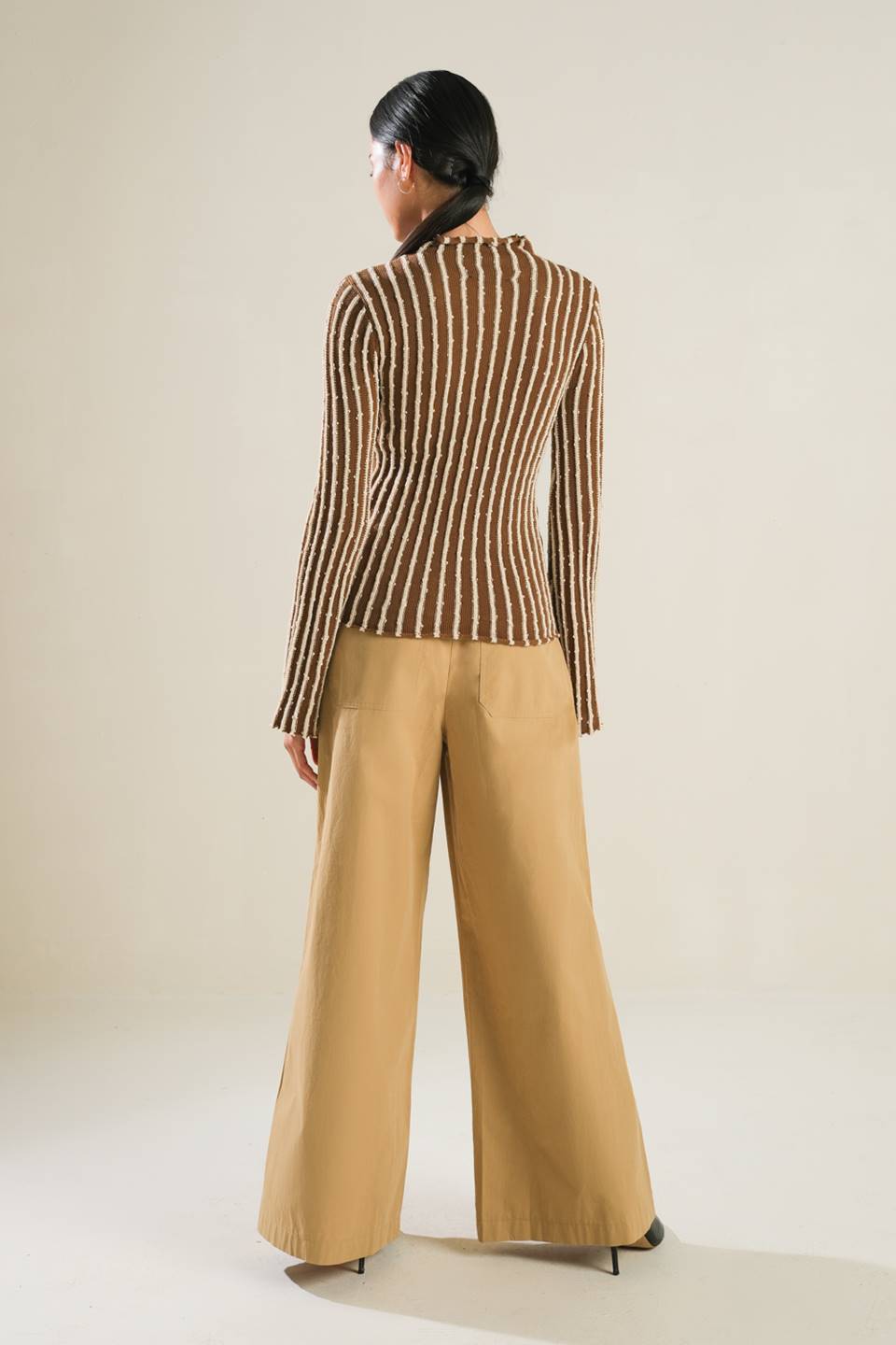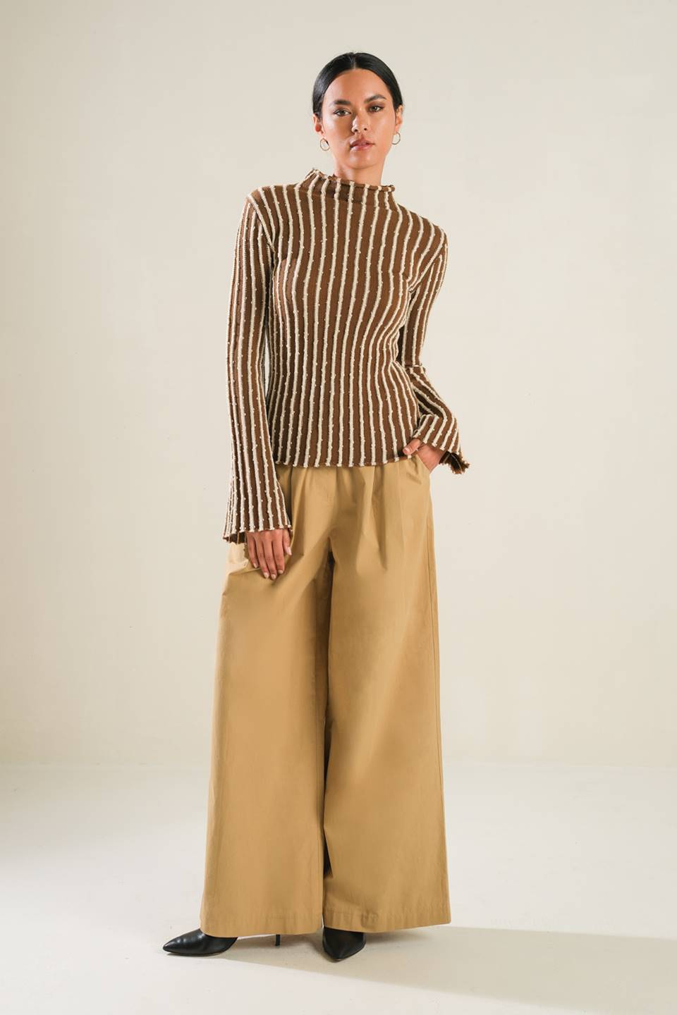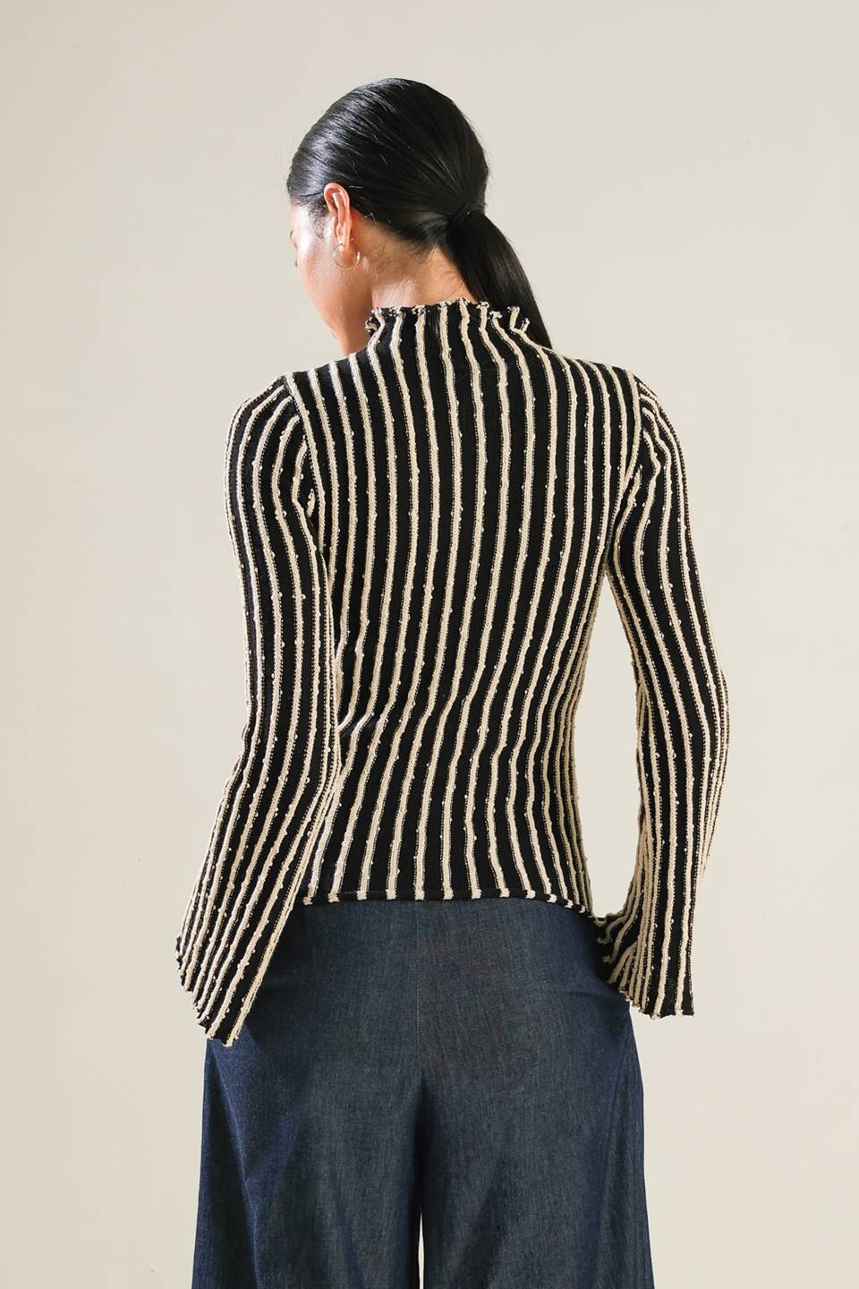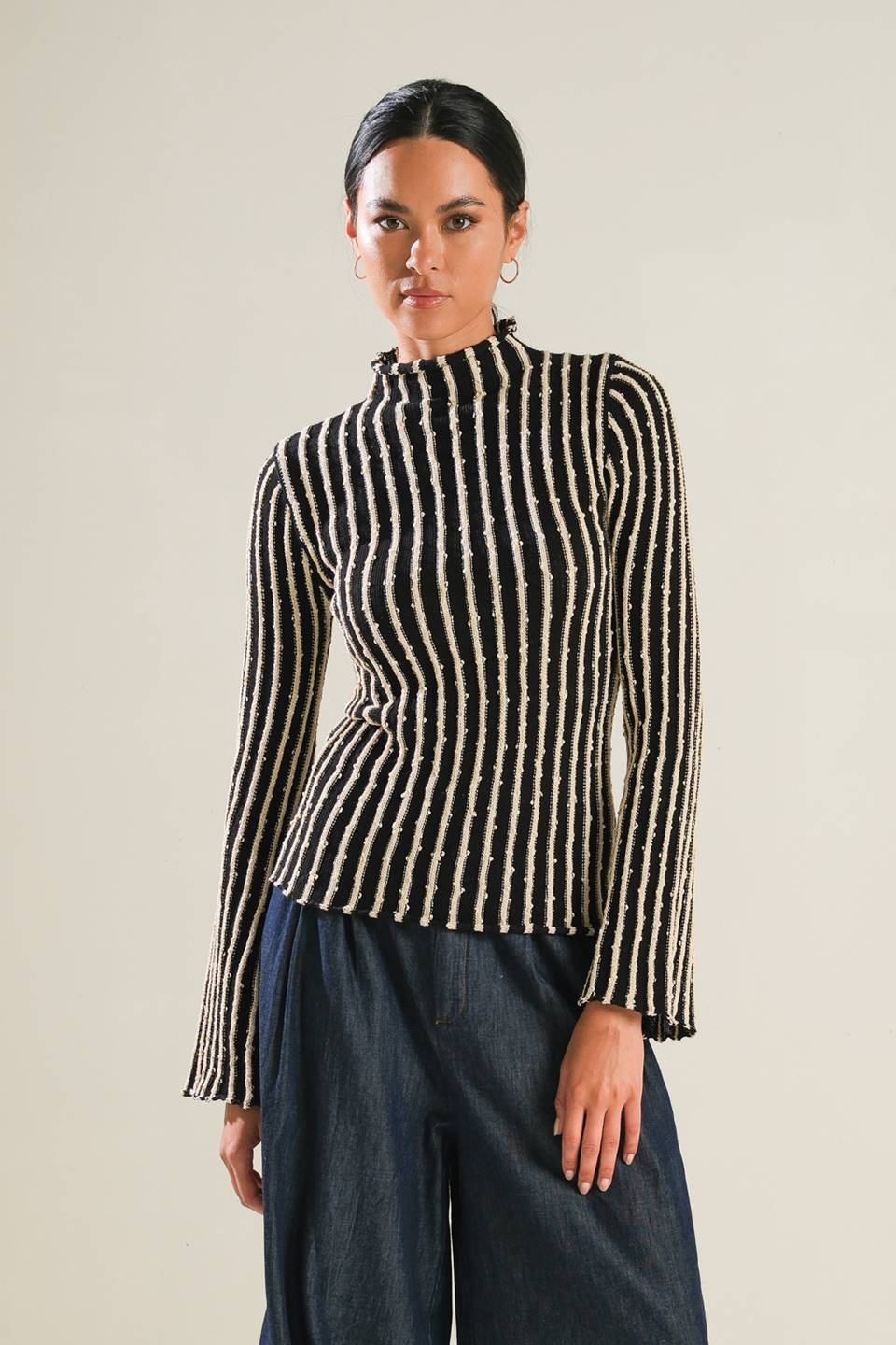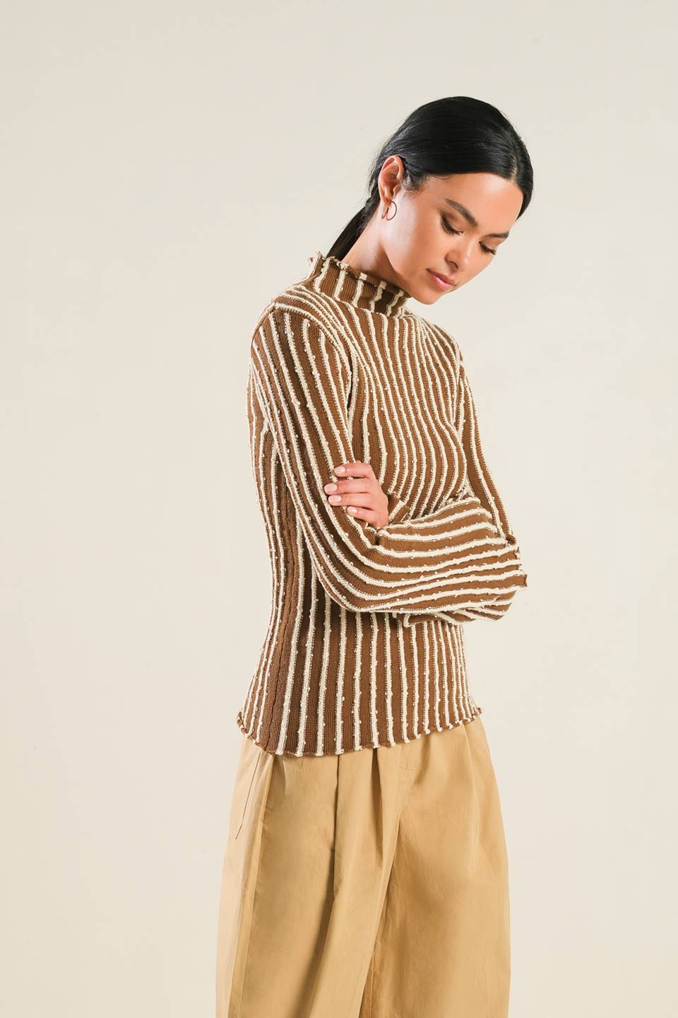 A sweater knit top with a high neckline and long-sleeve