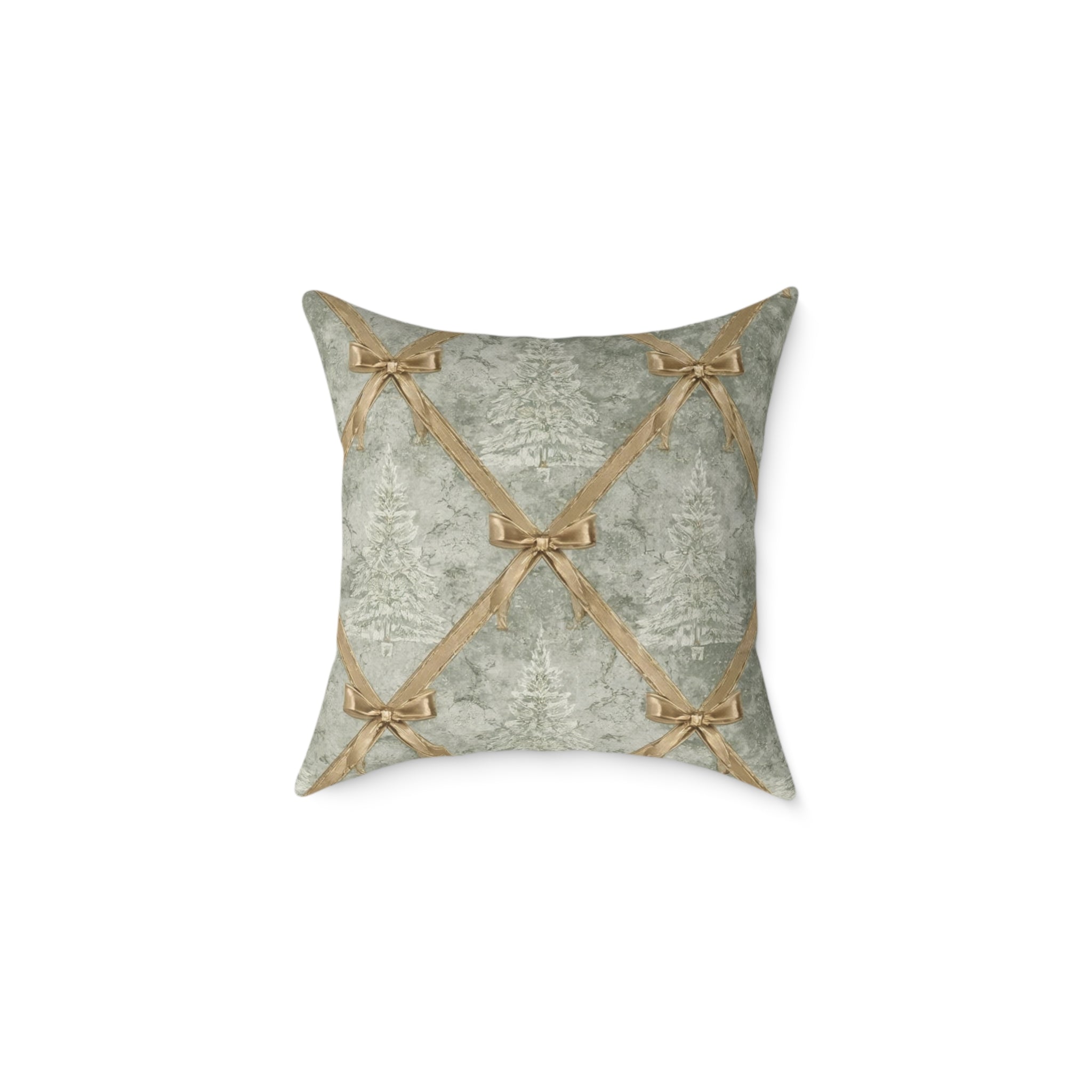 Add a touch of rustic elegance to your living space with the Green and Gold Christmas Throw Pillow. This exquisite holiday accent pillow features a subtle, frosted Christmas tree pattern layered with a stunning gold satin ribbon lattice secured by delicate bows. It's the perfect statement piece for your elegant Christmas decor.