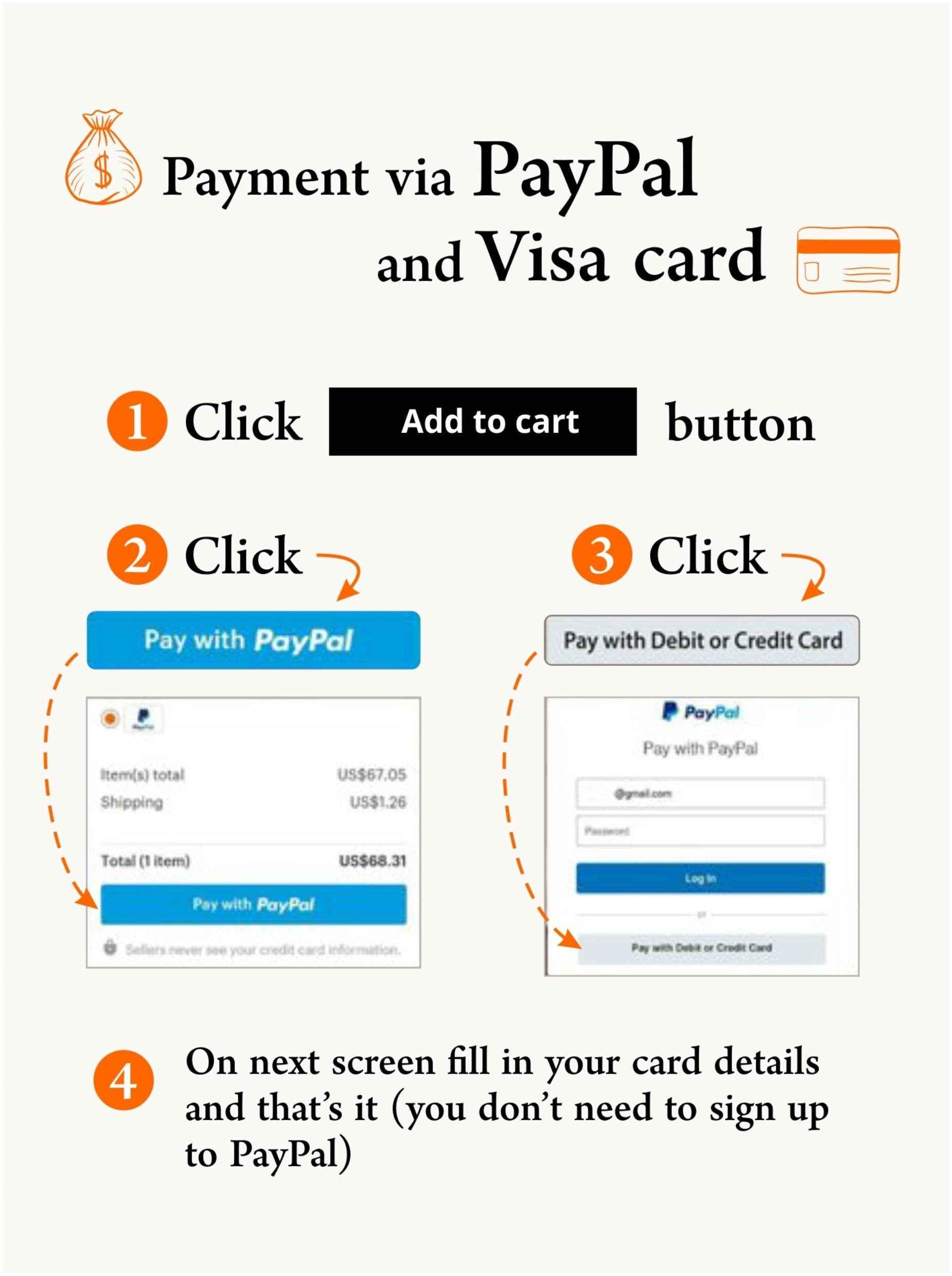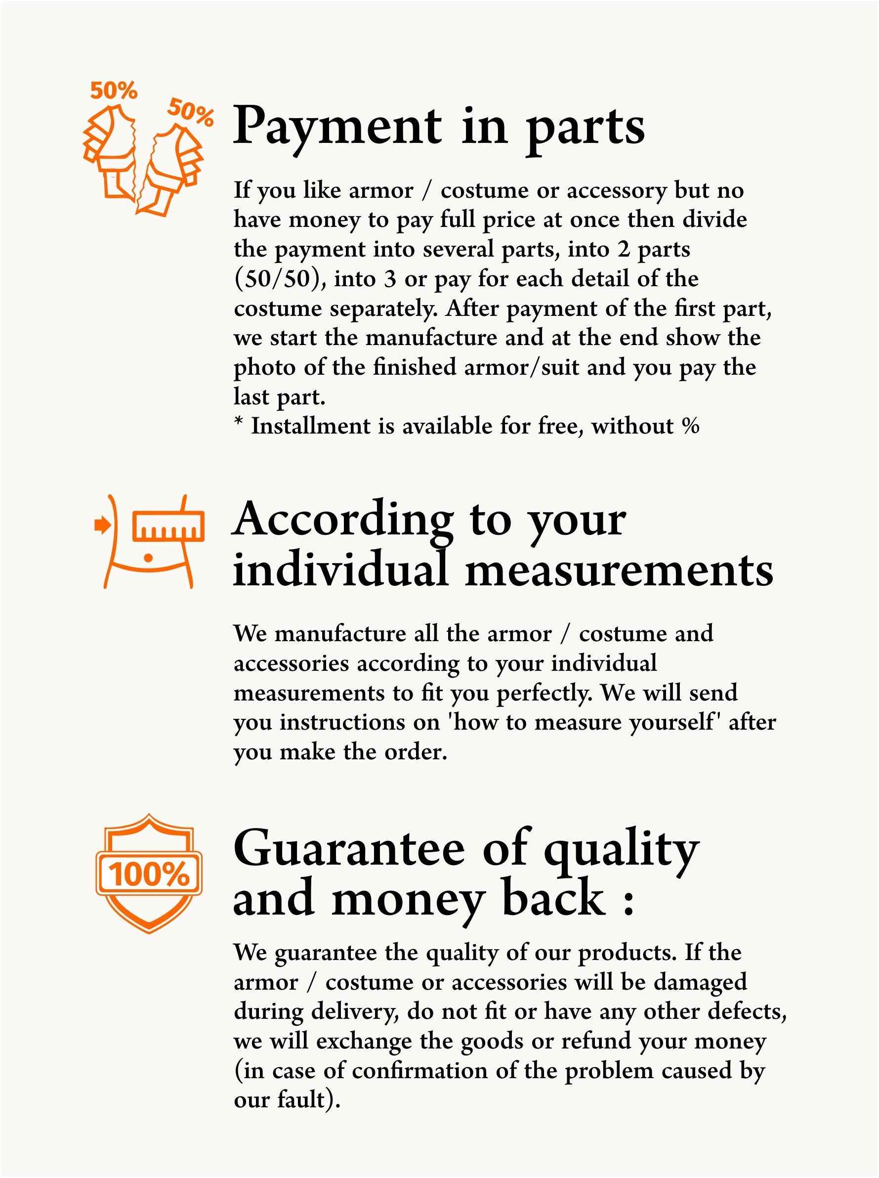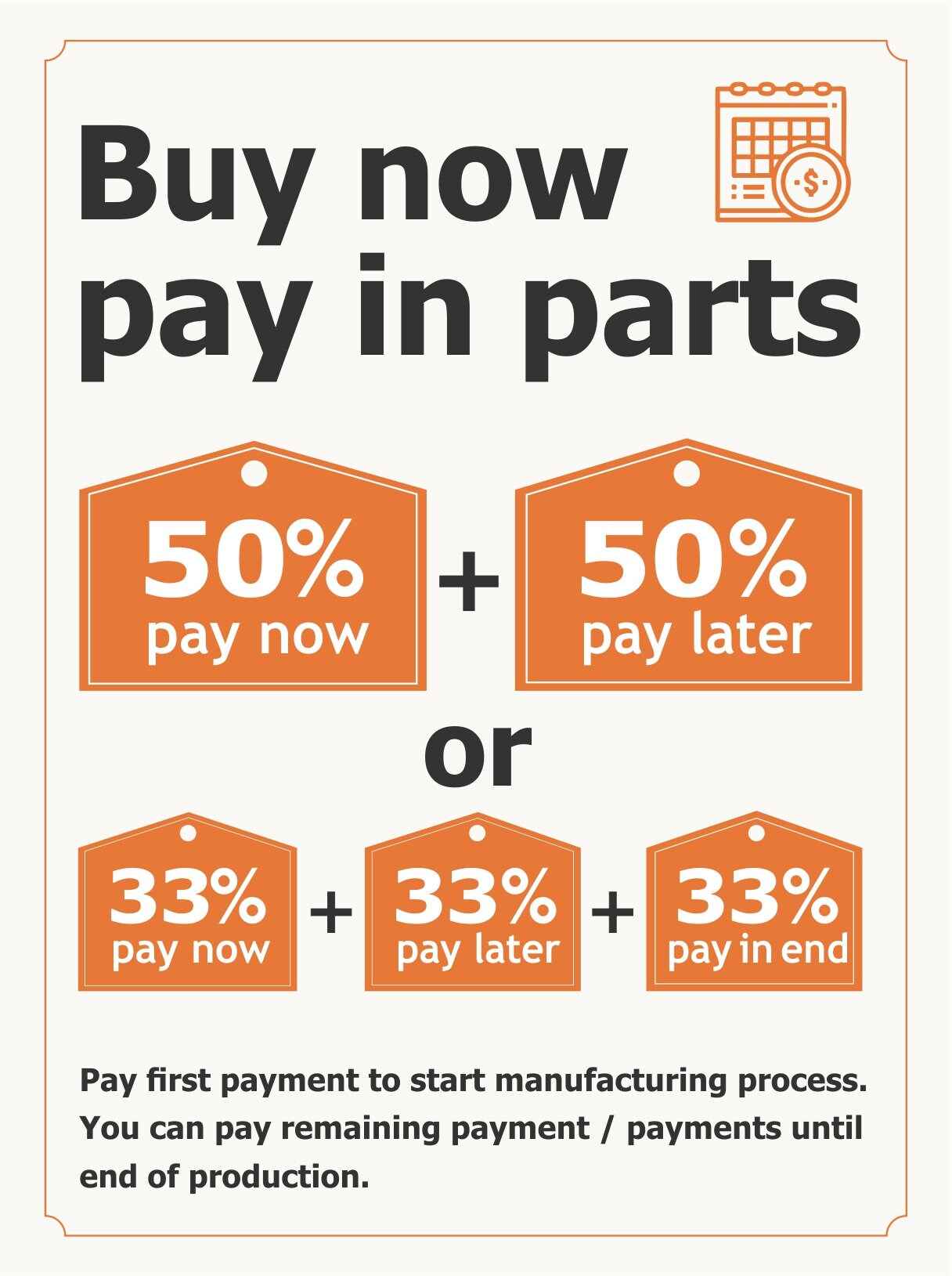 Also you can choose one of two payment options in parts: 33%+33%+33% or 50%+50% (select appropriate item in options of listing). You need to pay the first payment to start the manufacturing process. You can pay the remaining payment/payments until the end of production*. By the time the order is ready (you are shown a photo of the finished product) and the date of ship is set, the order must be paid in full (all payments are made).