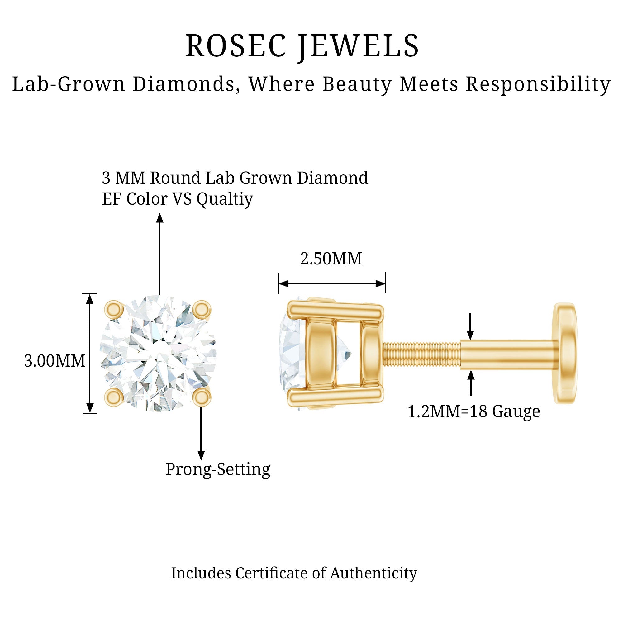 Minimalist Diamond Solitaire Earring for Tragus Piercing ‐ Lab - ( EF-VS ) / 18K Yellow Gold / Flat Back 5.0 MM