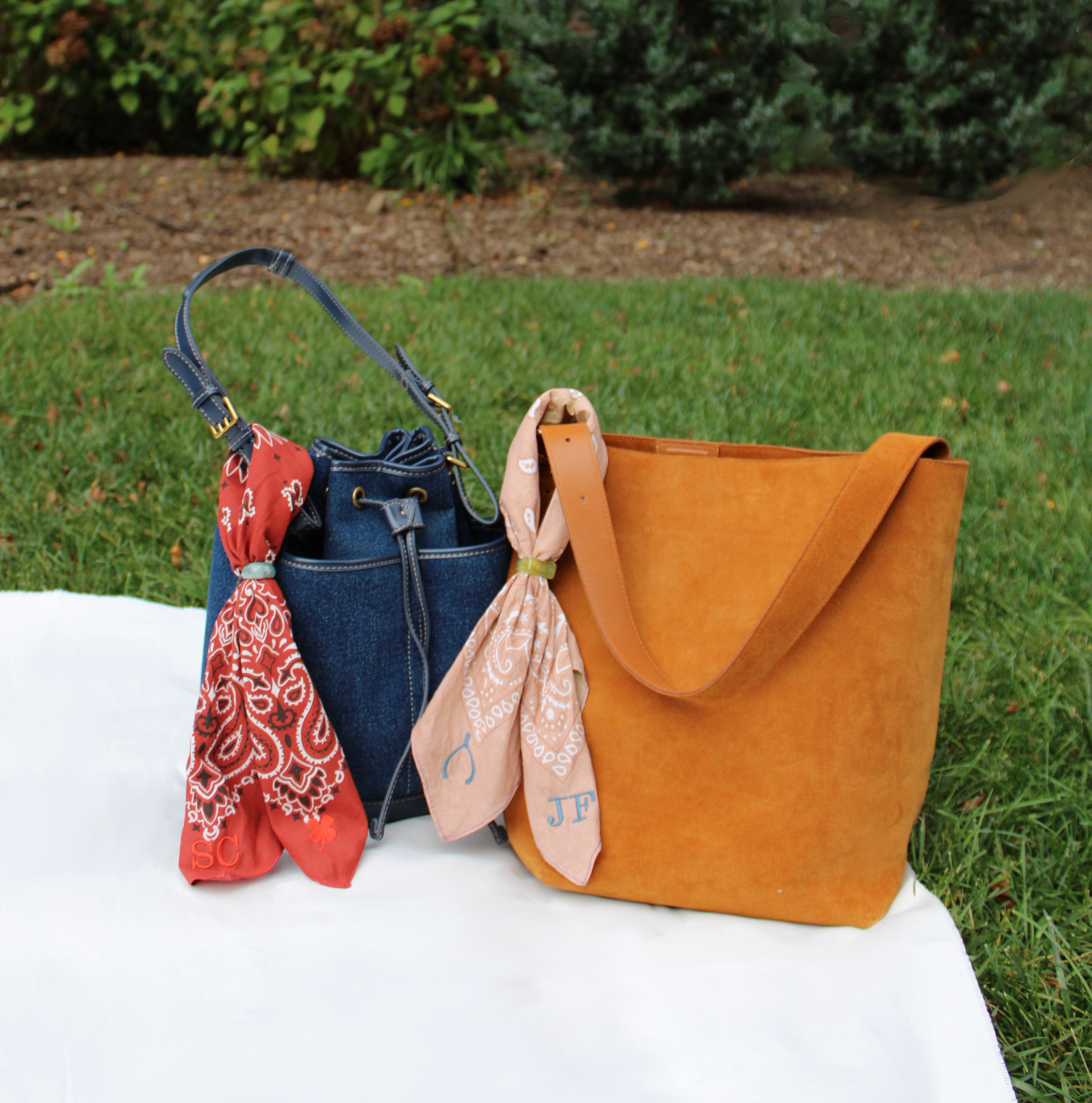 Add a personal touch to your outfit! Designed to hang off your favorite tote or wear around your neck. The Monogram Icon Bandana is (roughly) 22 x 22 inches, and comes with an acrylic ring to make styling extra fun!