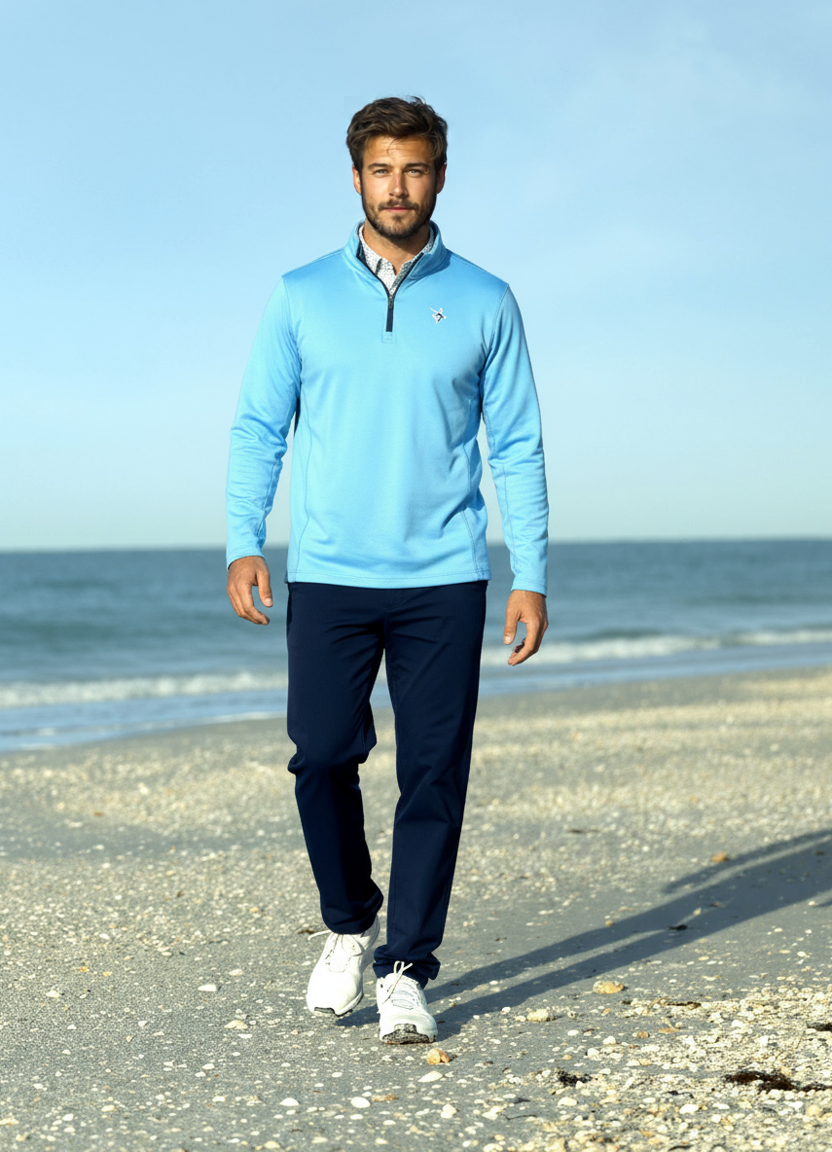 The tip of Long Islands east end. Montauk is famous for many things and just a great place to visit with family and friends. The Montauk 1/4 zip pullover features soft brushed poly spandex and side venting, for a great hand feel and just the right amount of stretch. Great for a harbor walk, out to dinner or a round of golf when a long sleeve top is needed.