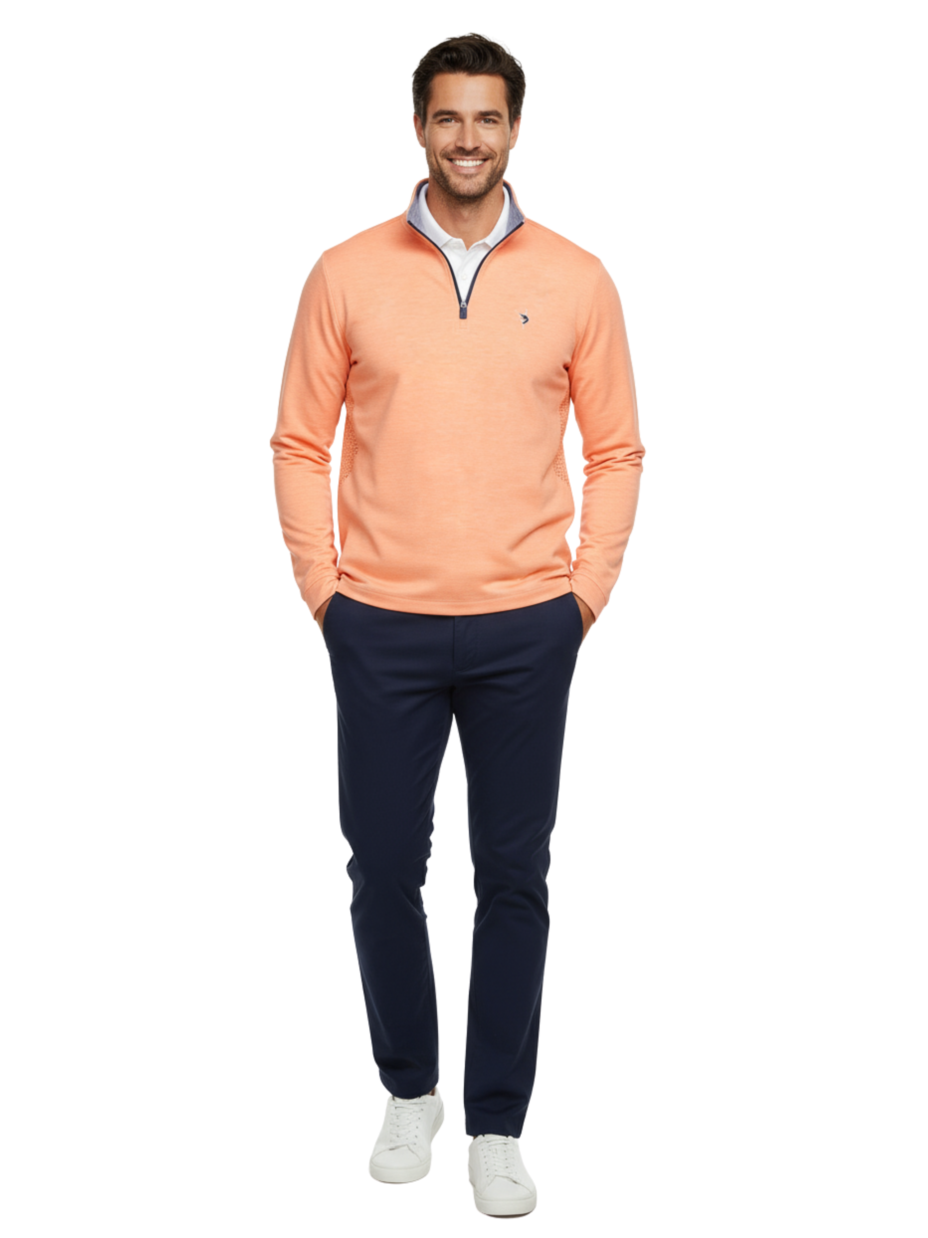 Lightweight Space Dye performance quarter zip featuring soft poly spandex wicking fabric. Sun Protection, UV50 with laser insert venting to keep you cool when needed and patented silicone sleeve grip which holds your sleeves in place and keeps them clean. Perfect for every day.
