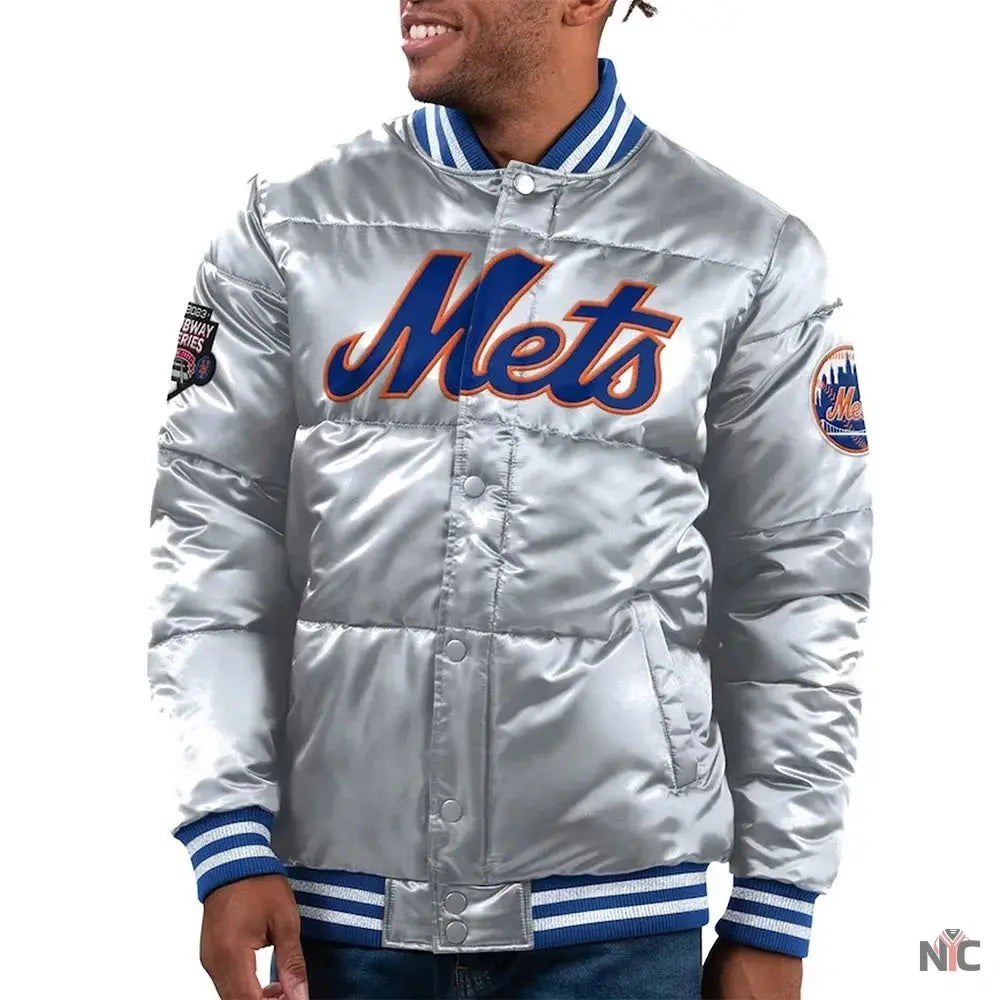 NY Mets Cooperstown Collection Bronx Puffer Satin Jacket ‐ Male / M / Silver