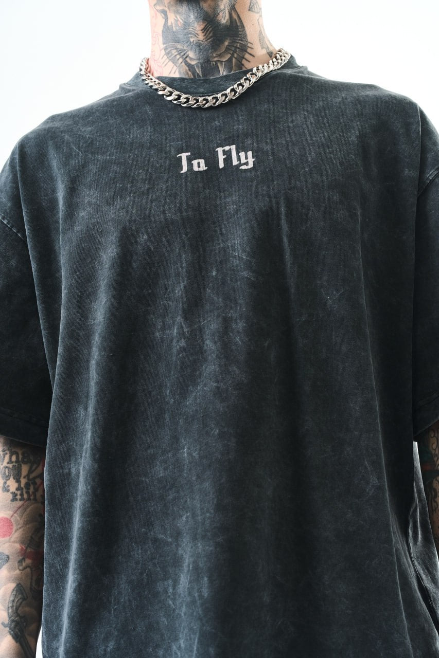 - Graphic print: flying crows and "To Fly" message