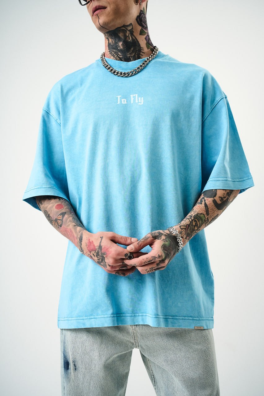 Oversize Cotton Tee - Crows and "To Fly" Graphic Print ‐ Blue / XL