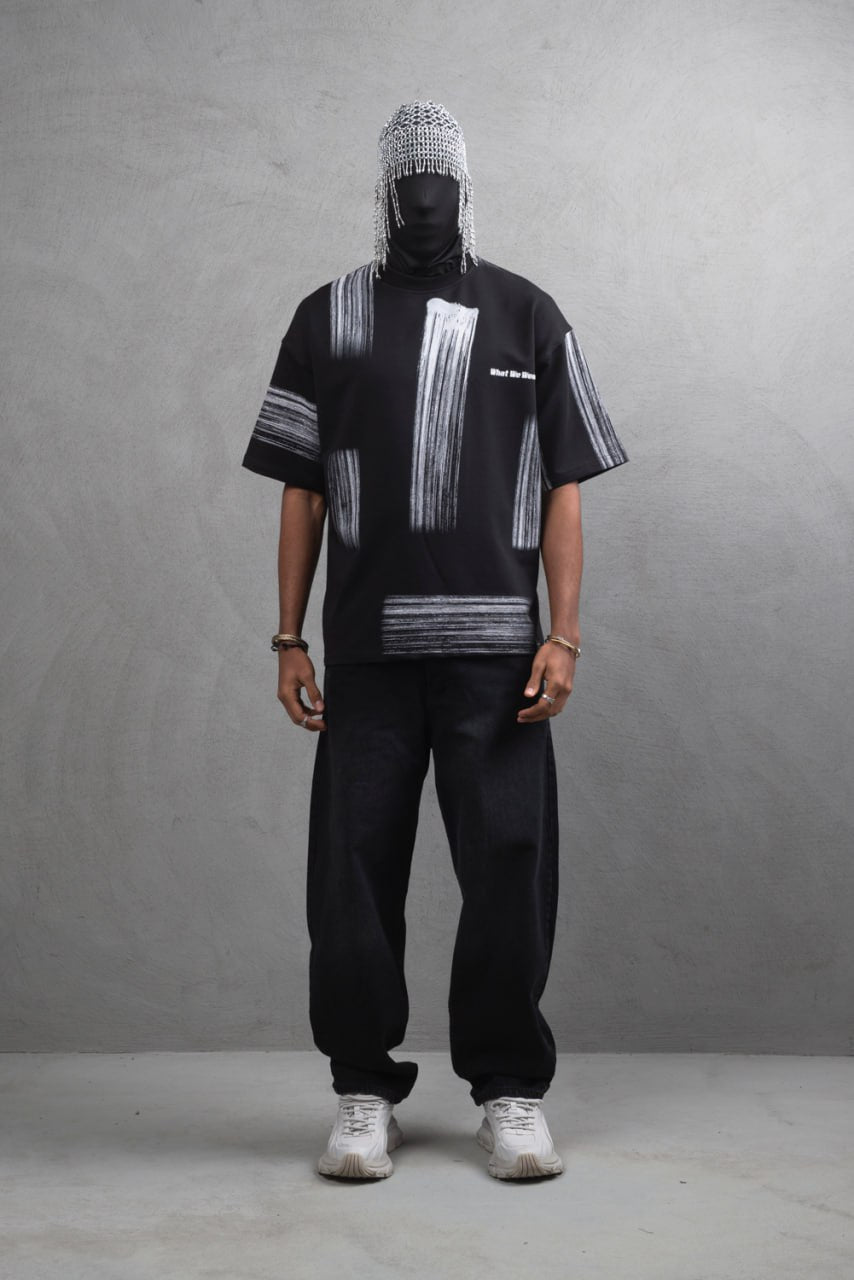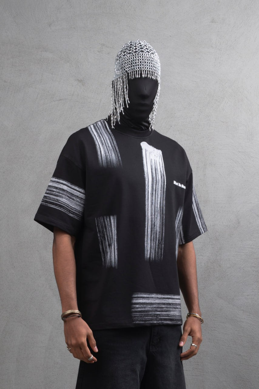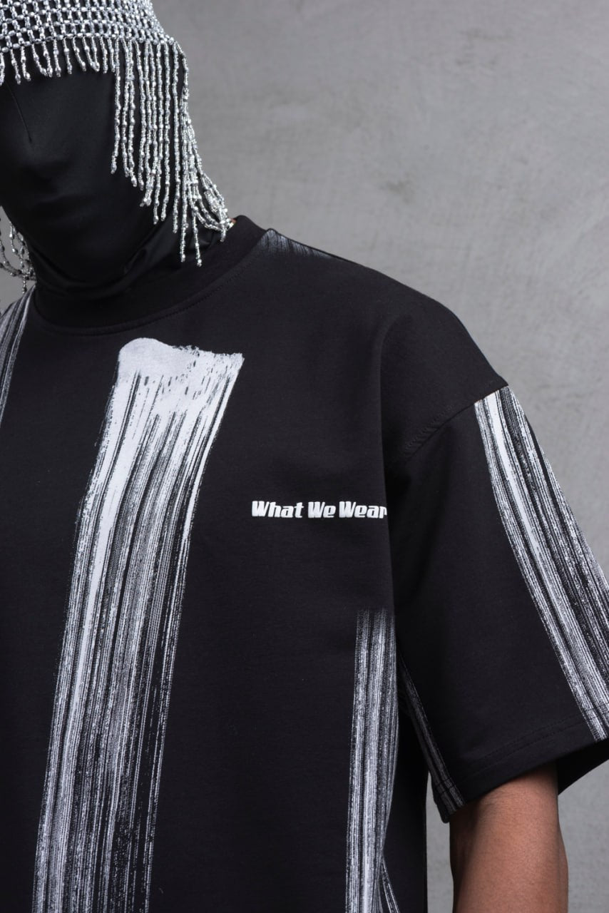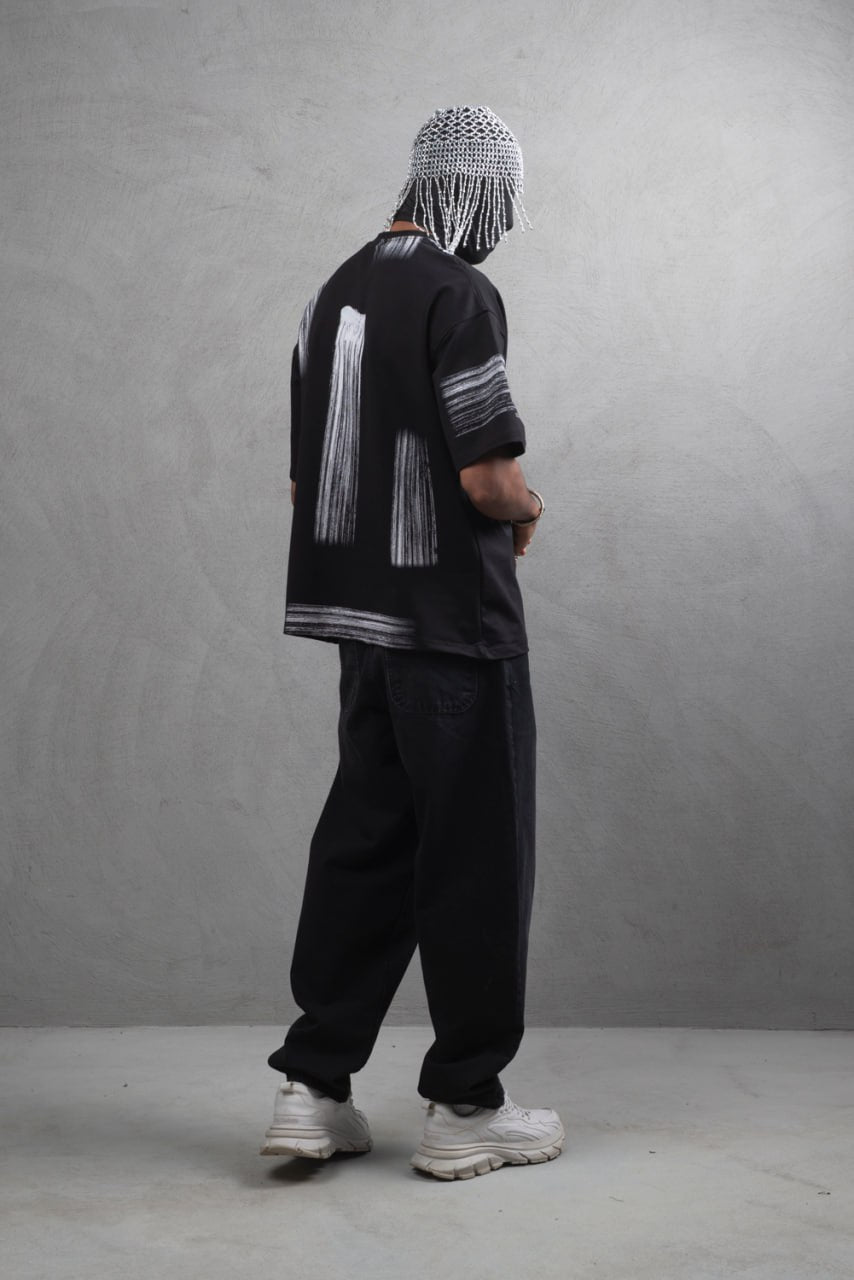 Oversize Graphic Cotton Tee - Abstract Vertical Stroke Print ‐ Black / XXL