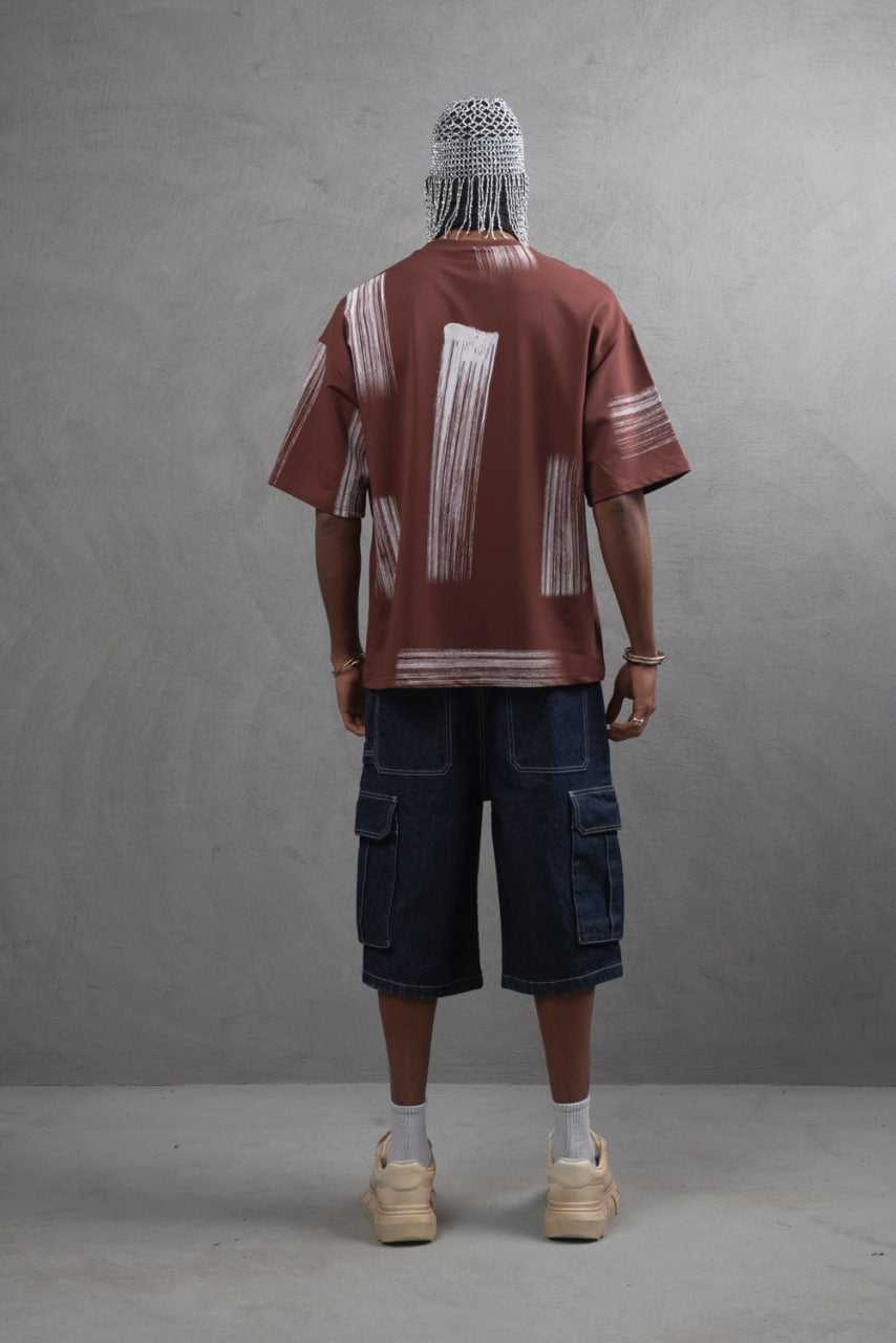 Oversize Graphic Cotton Tee - Abstract Vertical Stroke Print ‐ Brown / XXL