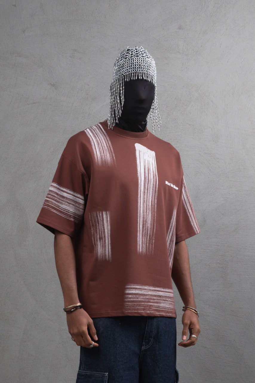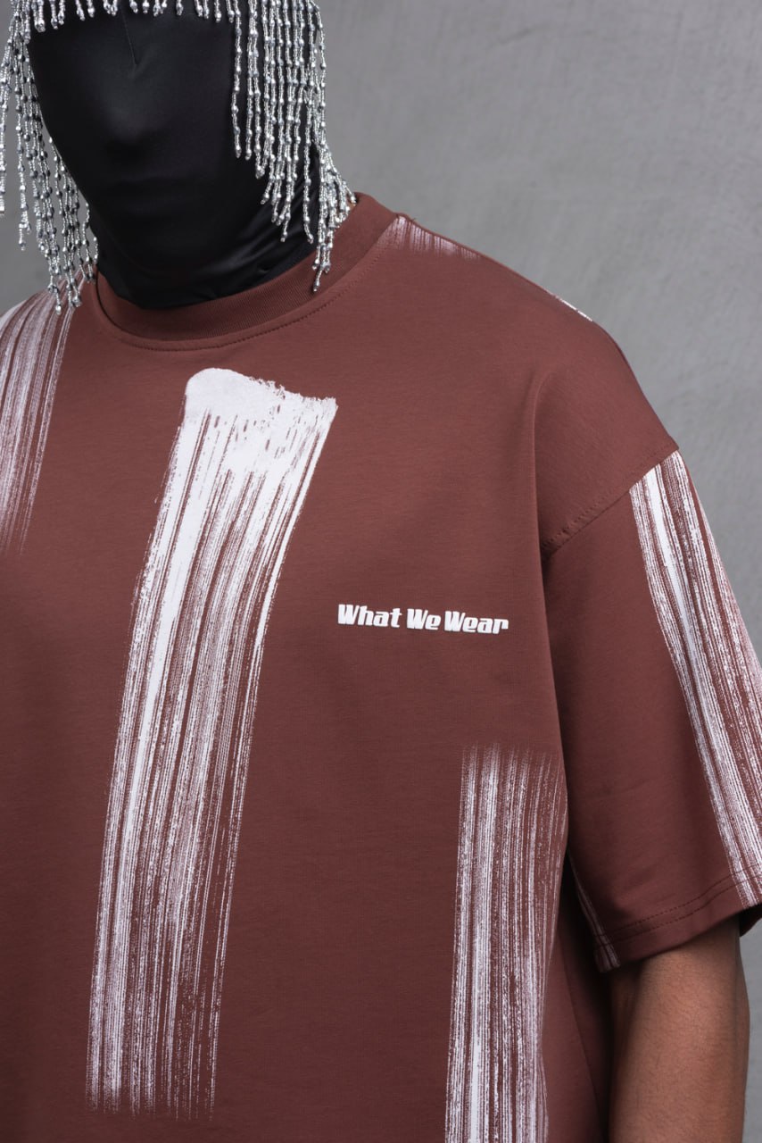 Oversize Graphic Cotton Tee - Abstract Vertical Stroke Print ‐ Brown / XL
