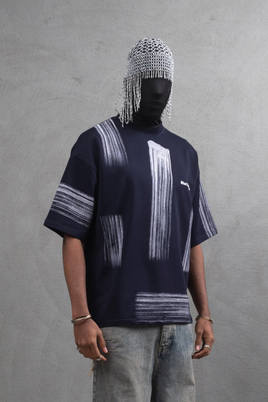 Oversize Graphic Cotton Tee - Abstract Vertical Stroke Print ‐ Navy / XL