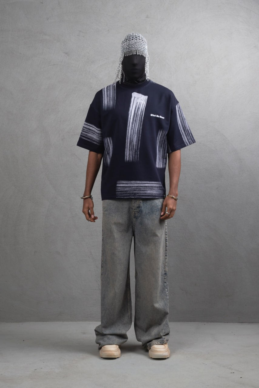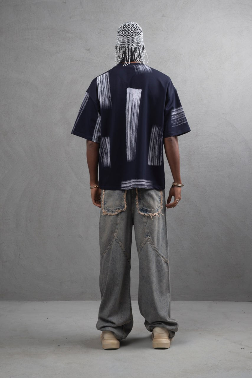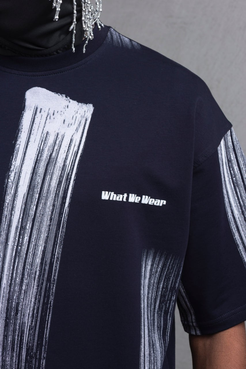 Oversize Graphic Cotton Tee - Abstract Vertical Stroke Print ‐ Navy / XXL