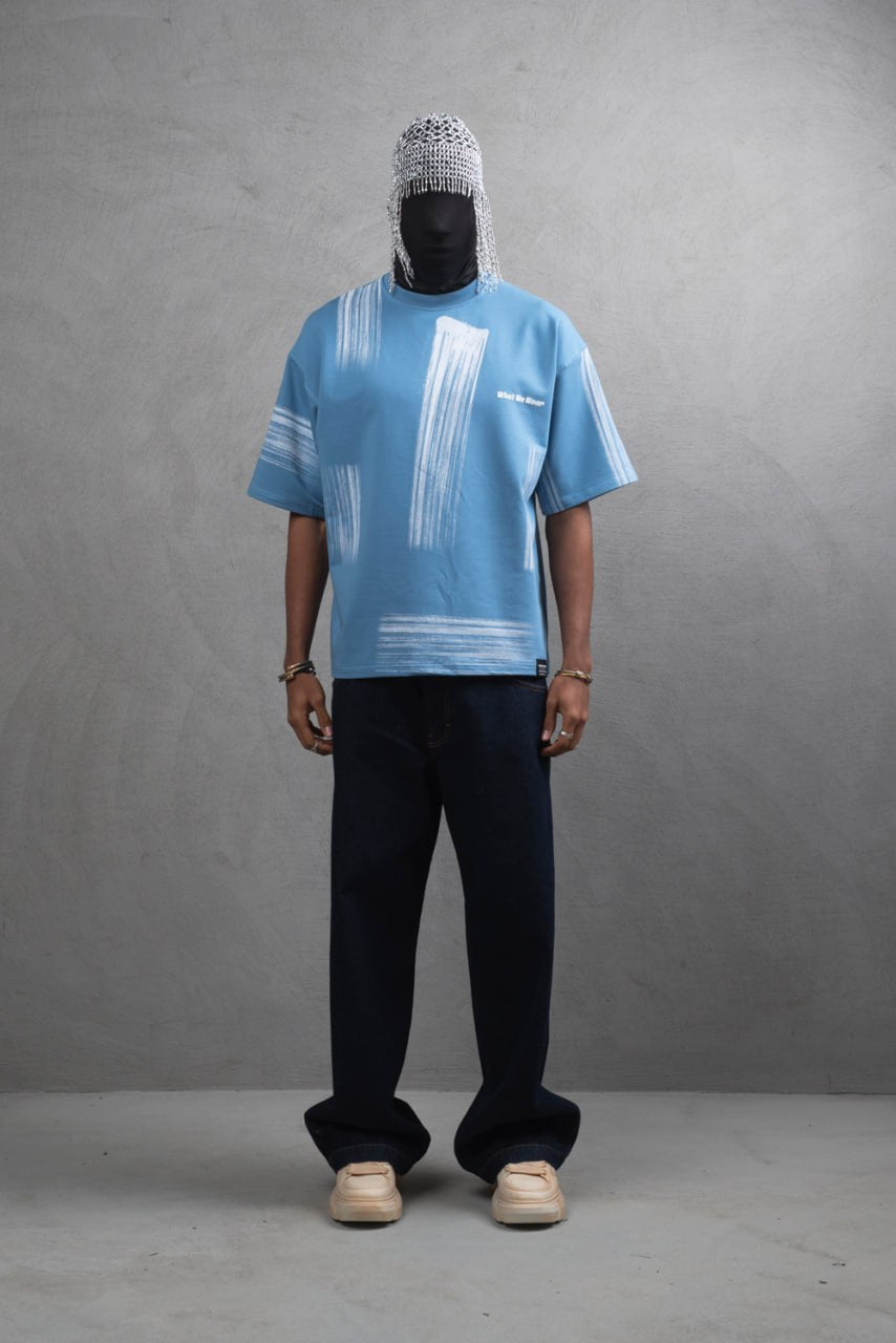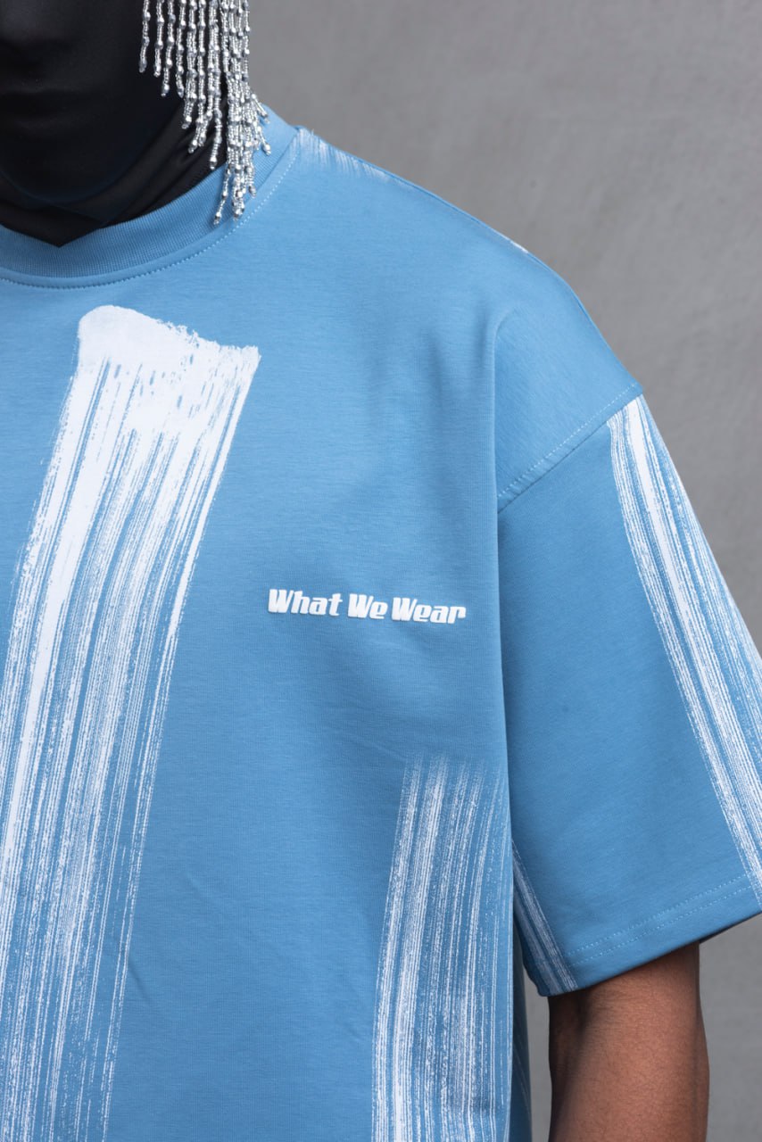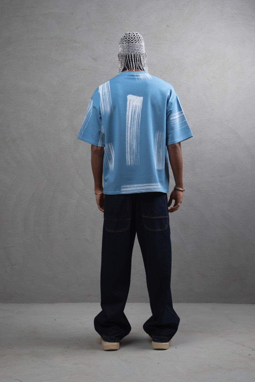 Oversize Graphic Cotton Tee - Abstract Vertical Stroke Print ‐ Light Blue / L