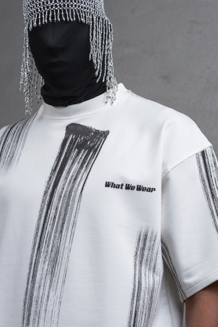 Oversize Graphic Cotton Tee - Abstract Vertical Stroke Print ‐ White / XXL