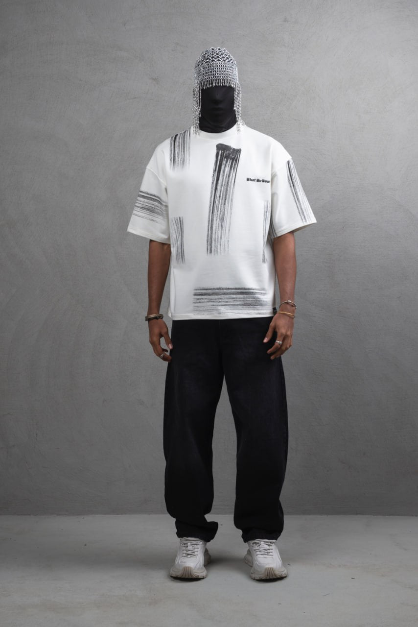 Oversize Graphic Cotton Tee - Abstract Vertical Stroke Print ‐ White / XL