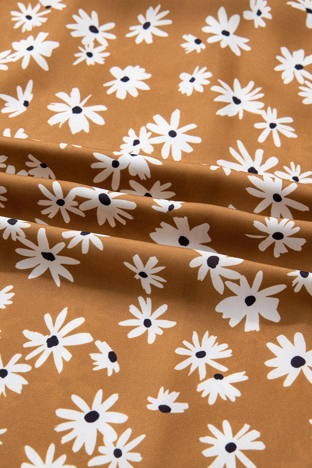 Plus Size Floral Split Neck Button Puff Sleeve Dress ‐ Khaki / 2X