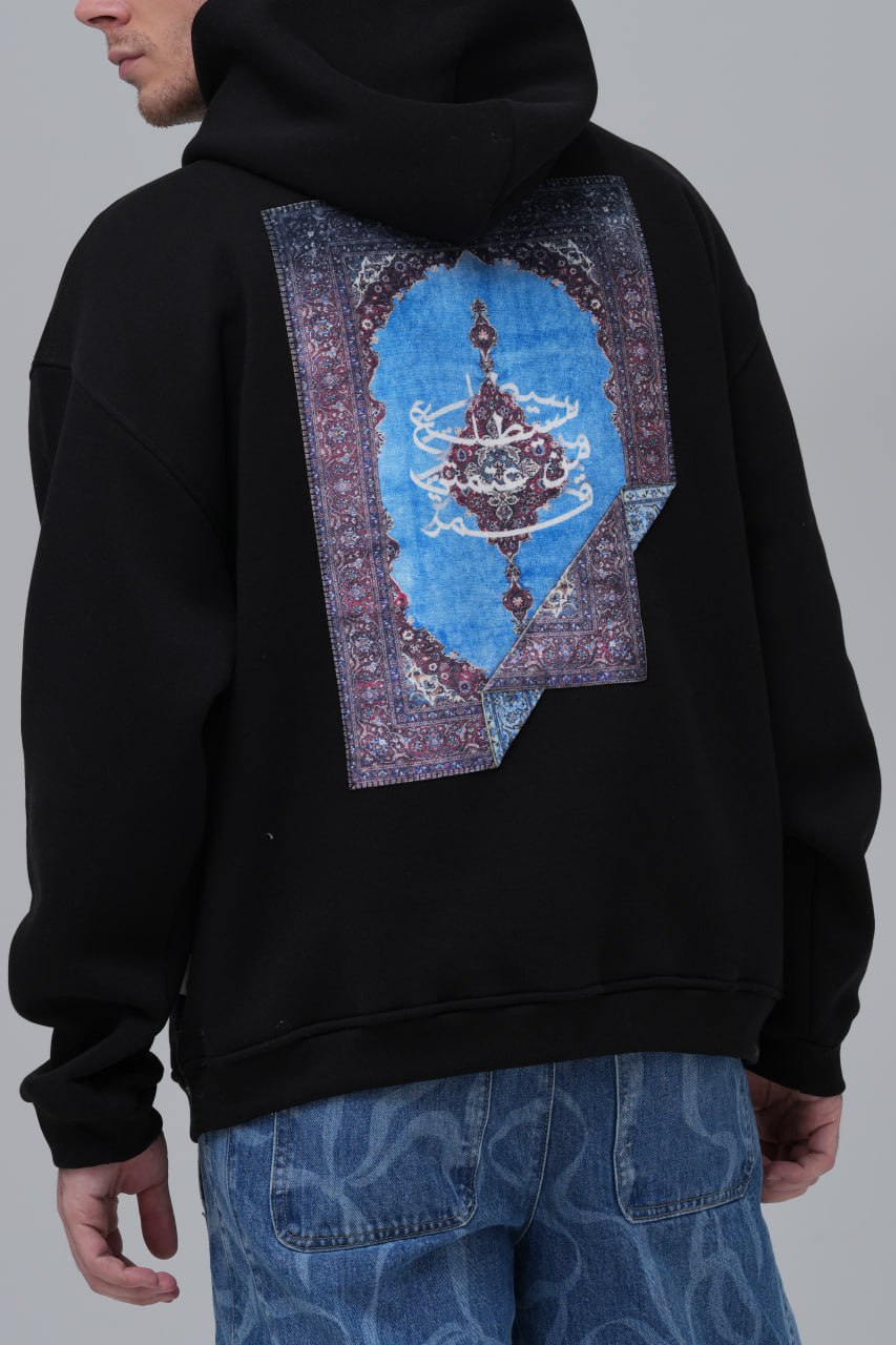 The Saw Prayer Rug Graphic Hoodie blends timeless Arabic calligraphy with a prayer rug-inspired design, creating a unique balance of culture and fashion.