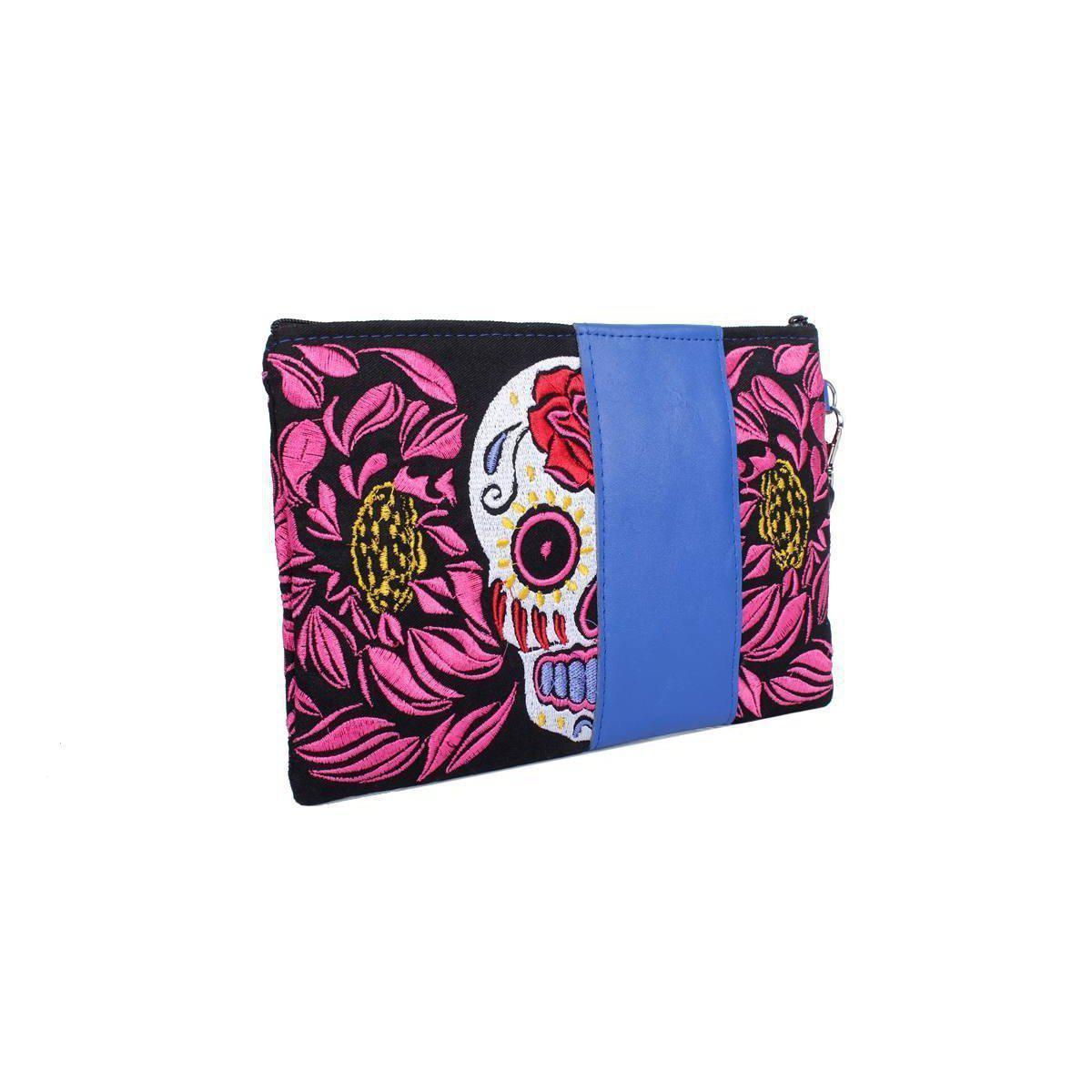 Our Sugar Skull and Tribal wristlet / clutch is perfect for a night out! The zipper closure is decorated with a skull and pom pom decoration. Wrist strap is a comfortable 6" in length. Fully lined with an inside zip pocket. Hand crafted in Northern Thailand.