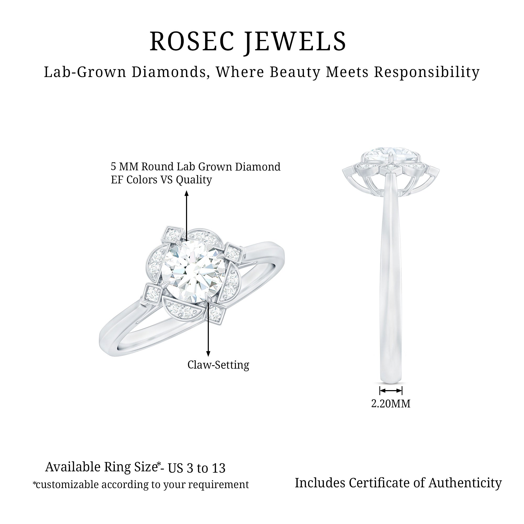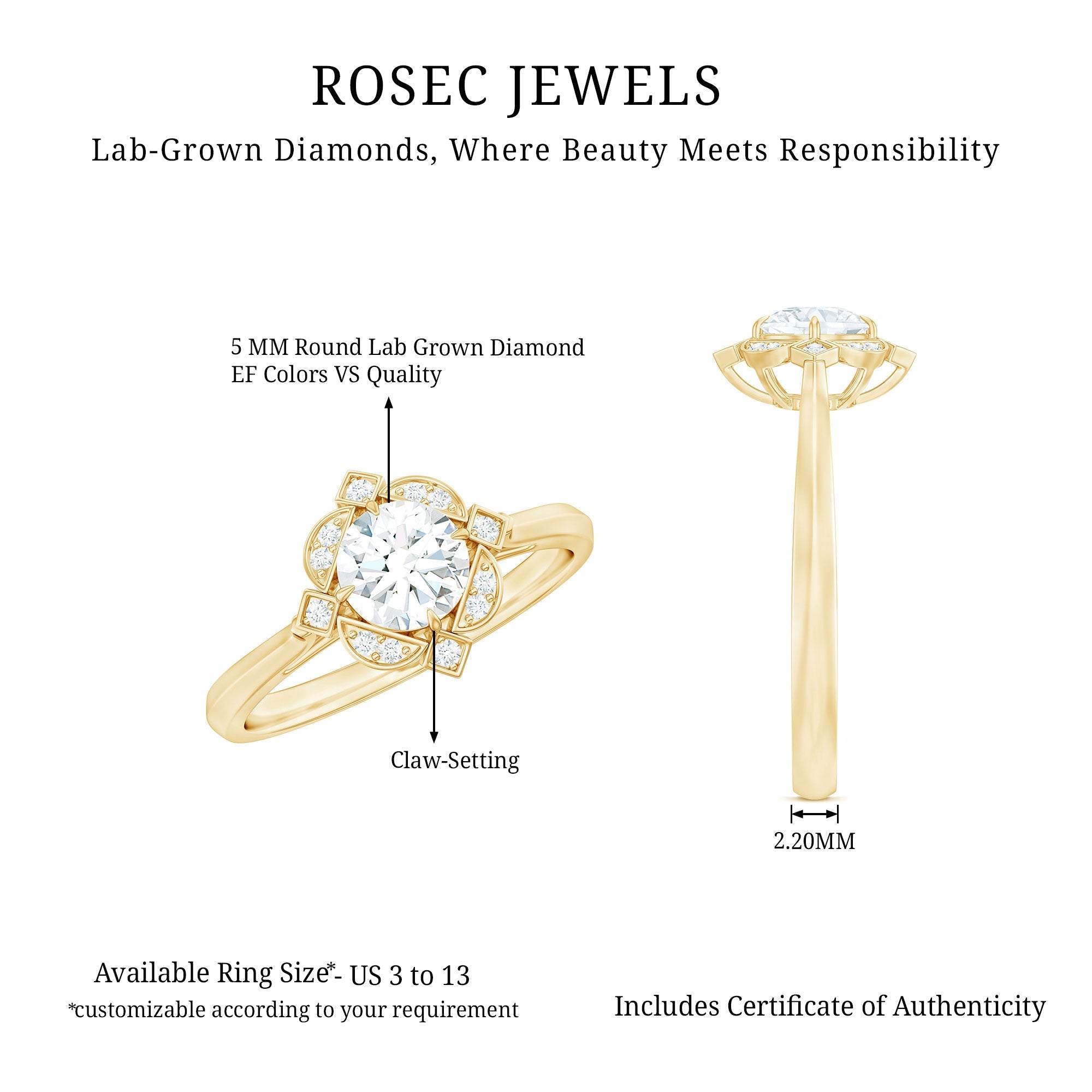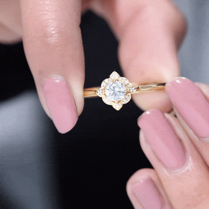 If old-school gestures of love make their way straight to her heart, this Vintage Lab Grown Diamond Engagement Ring is the one to pop the question with. Sparkling as bright as your love is the Centerpiece of 5 MM Round Shape Lab Grown Diamond in Claw Setting, that is effortlessly complemented by a scintillating Halo over an Abstract Art Deco Pattern for a more defined and retro touch.