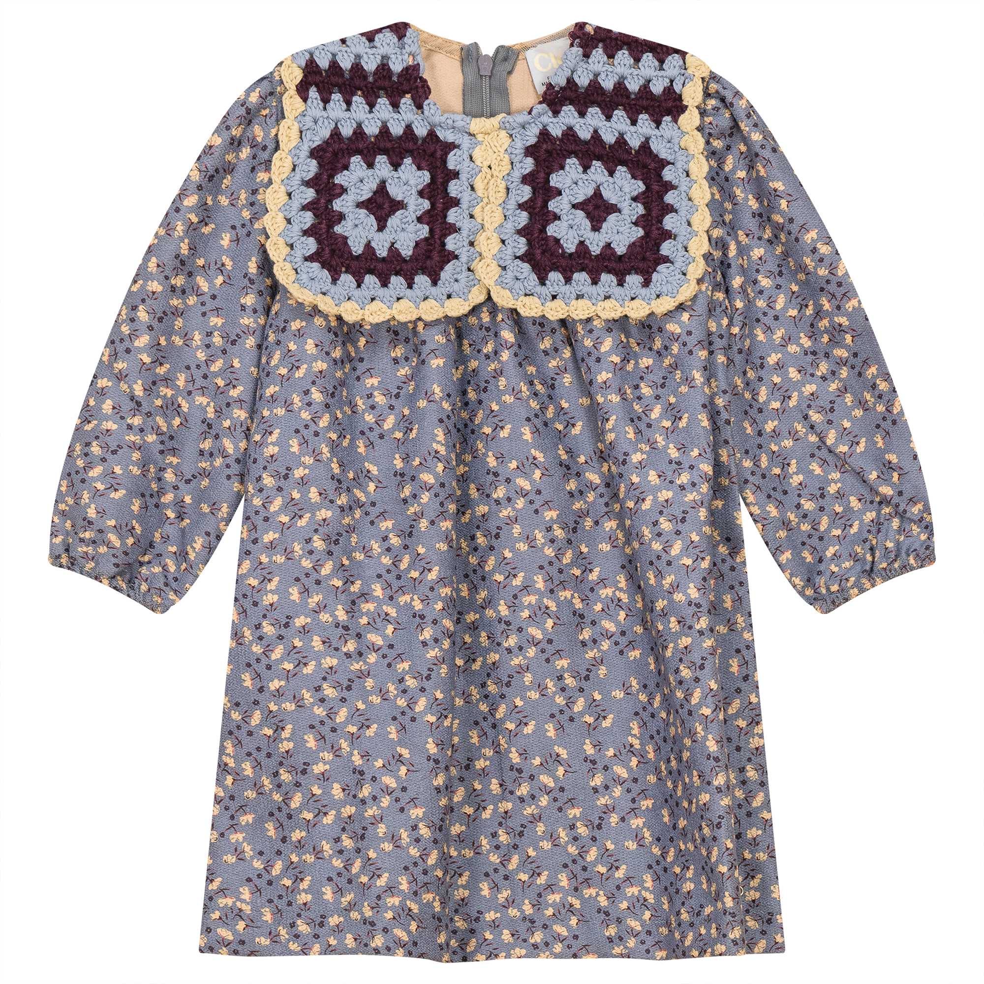 Girls long sleeve woven suede flower print dress with crochet collar, center back invisible zipper and elastic at cuffs. ֲ