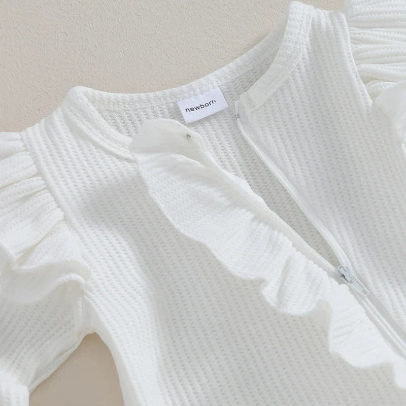 Baby Girl 2Pcs Clothes Ruffle Zipper Romper Long Sleeve Jumpsuit with Bow Headband ‐ WHITE / United States / 3M