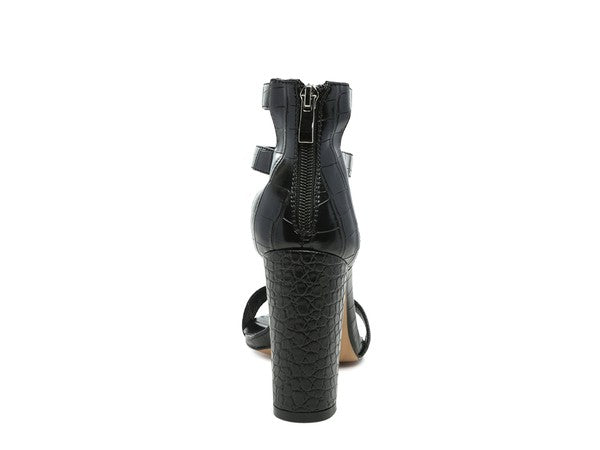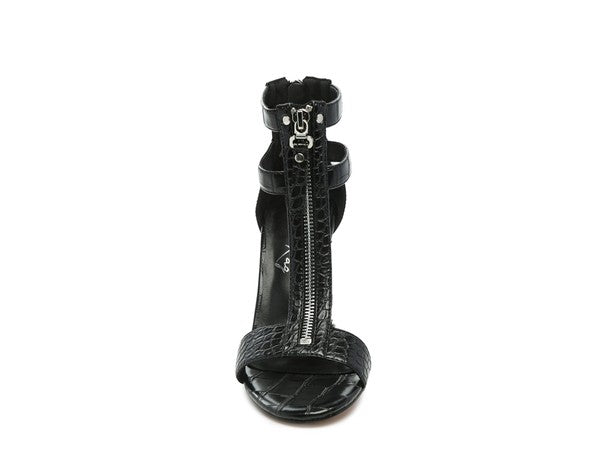 High heeled croc textured sandal with zipper opening on front and back. The stylish sandal looks gorgeous on the feet and has a soft anti-slip insole.