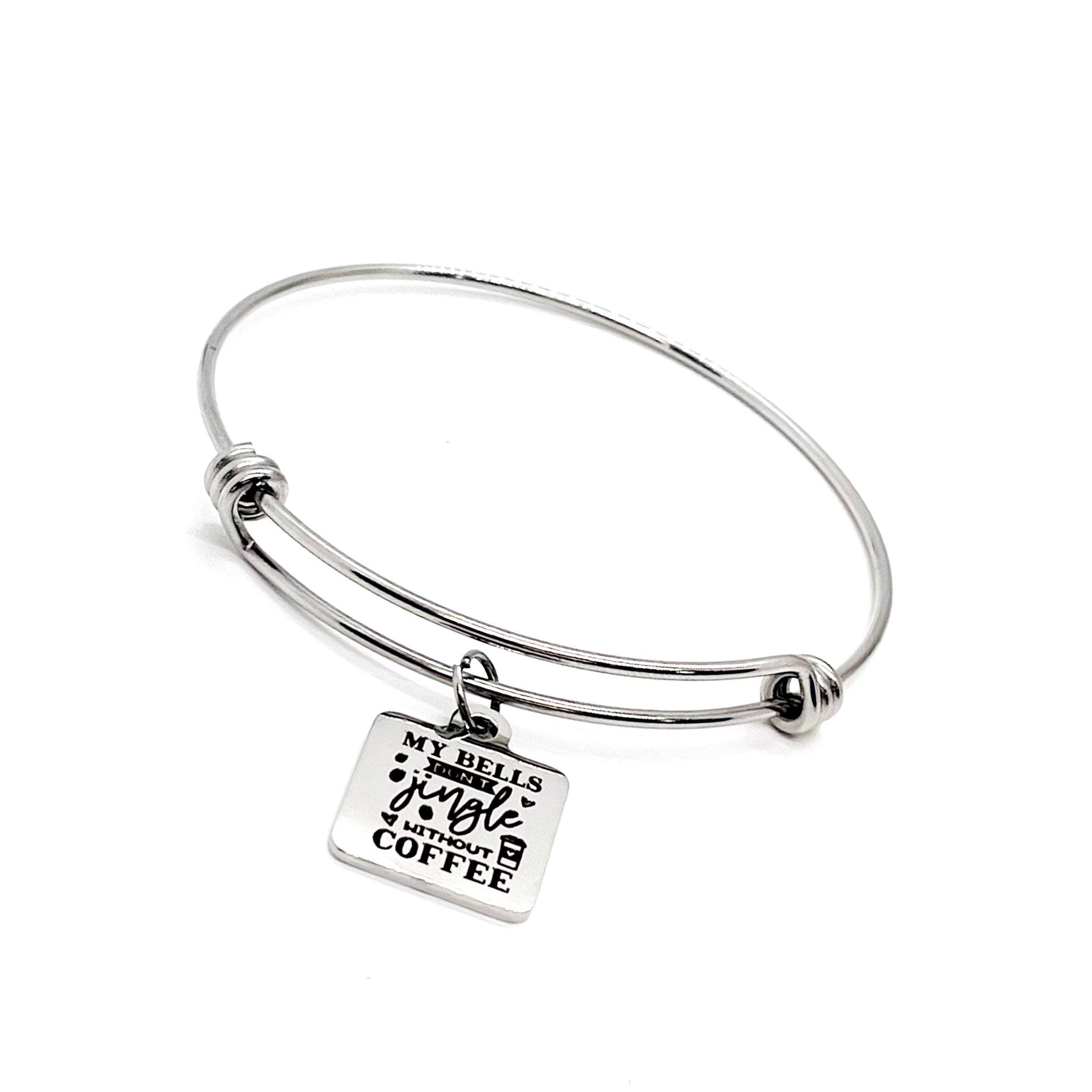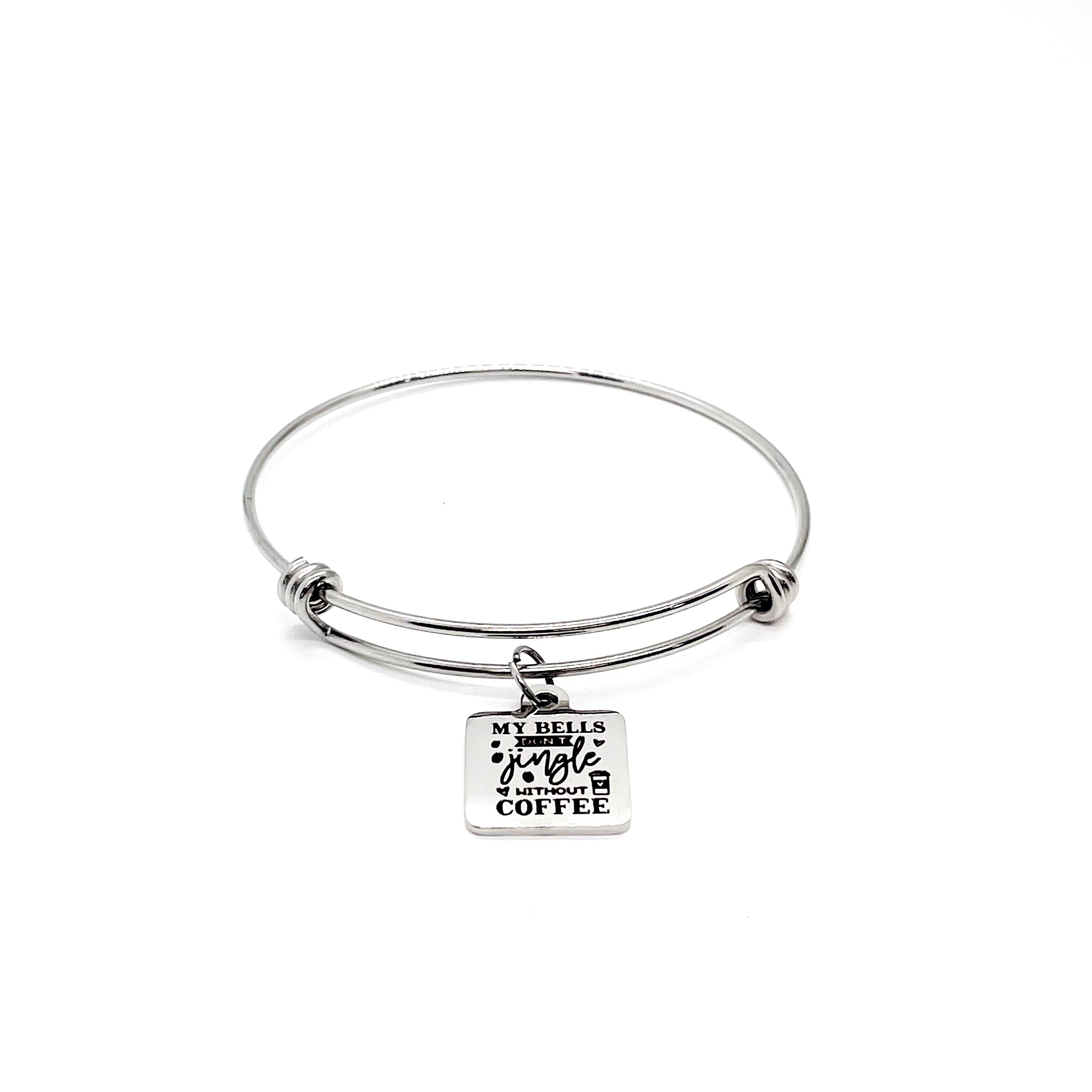This stacking bangle bracelet has a stainless steel laser engraved charm that says “My bells don’t jingle without coffee" on it.