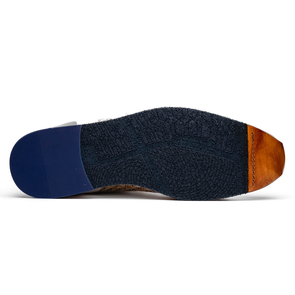 Our Ripi is a calfskin dressy sneaker with a colorful hand weave design and a contrast color rubber outsole. Suede accents give this shoe a versatility for dress or casual wear.