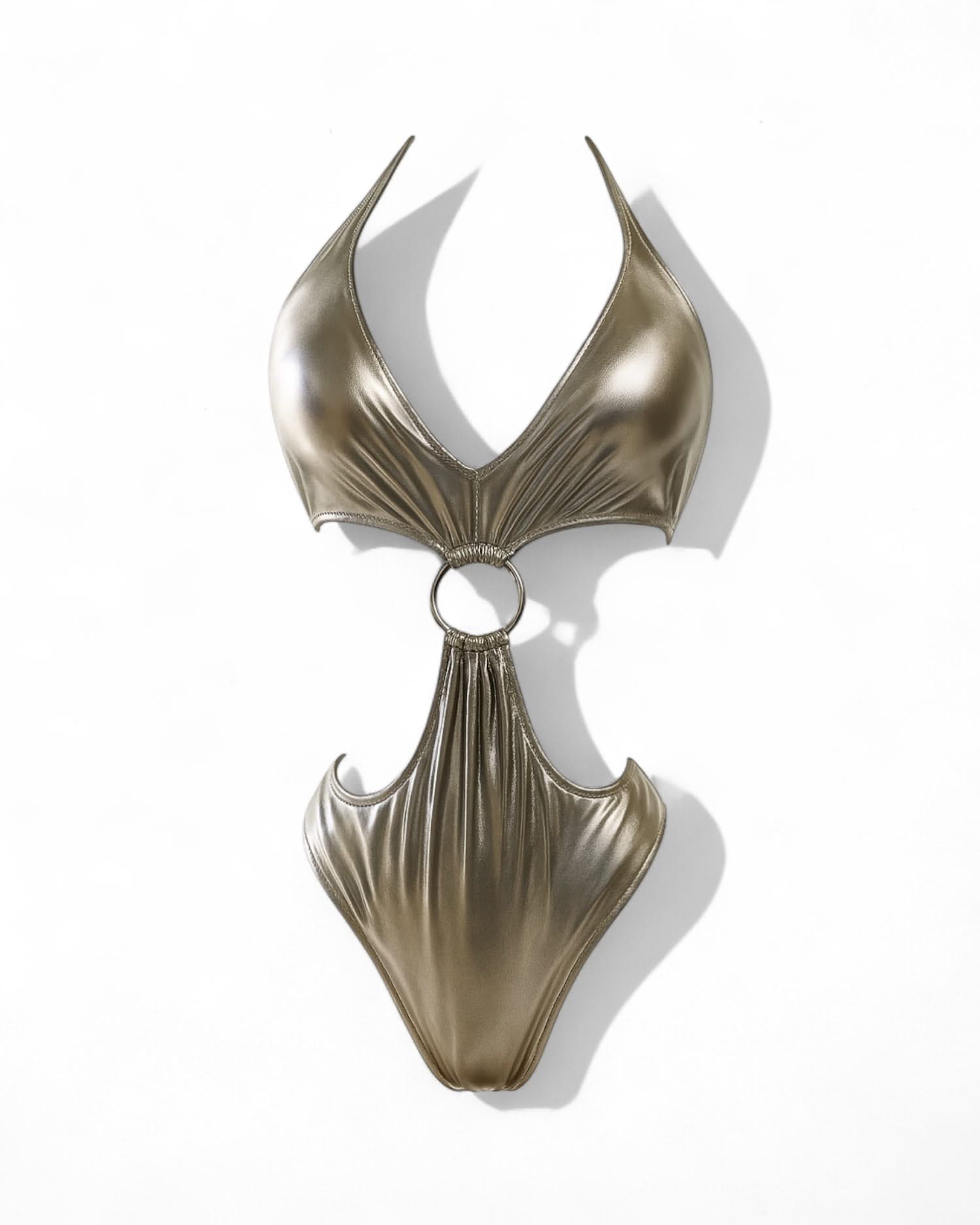 Turn heads with every step in the Metallic Gold One-Piece Swimsuit from Mabel Love Co.. Designed for the bold and fashion-forward, this show-stopping swimsuit is your go-to for glamorous beach days, luxury pool parties, or standout resort wear. With a daring deep V-neckline and striking midsection cut-out joined by a sleek circular ring, this piece isn’t just swimwear—it’s a full-on vibe.